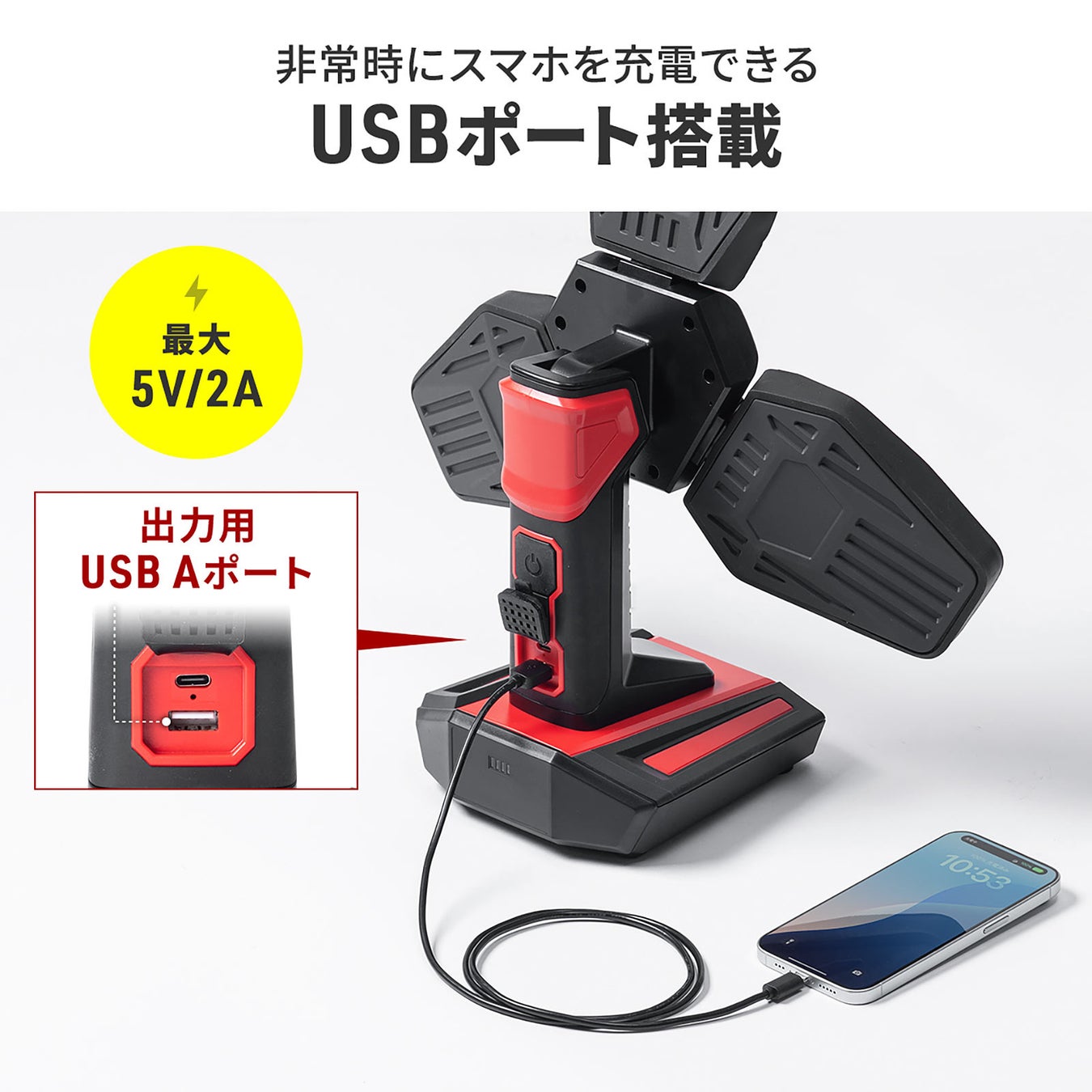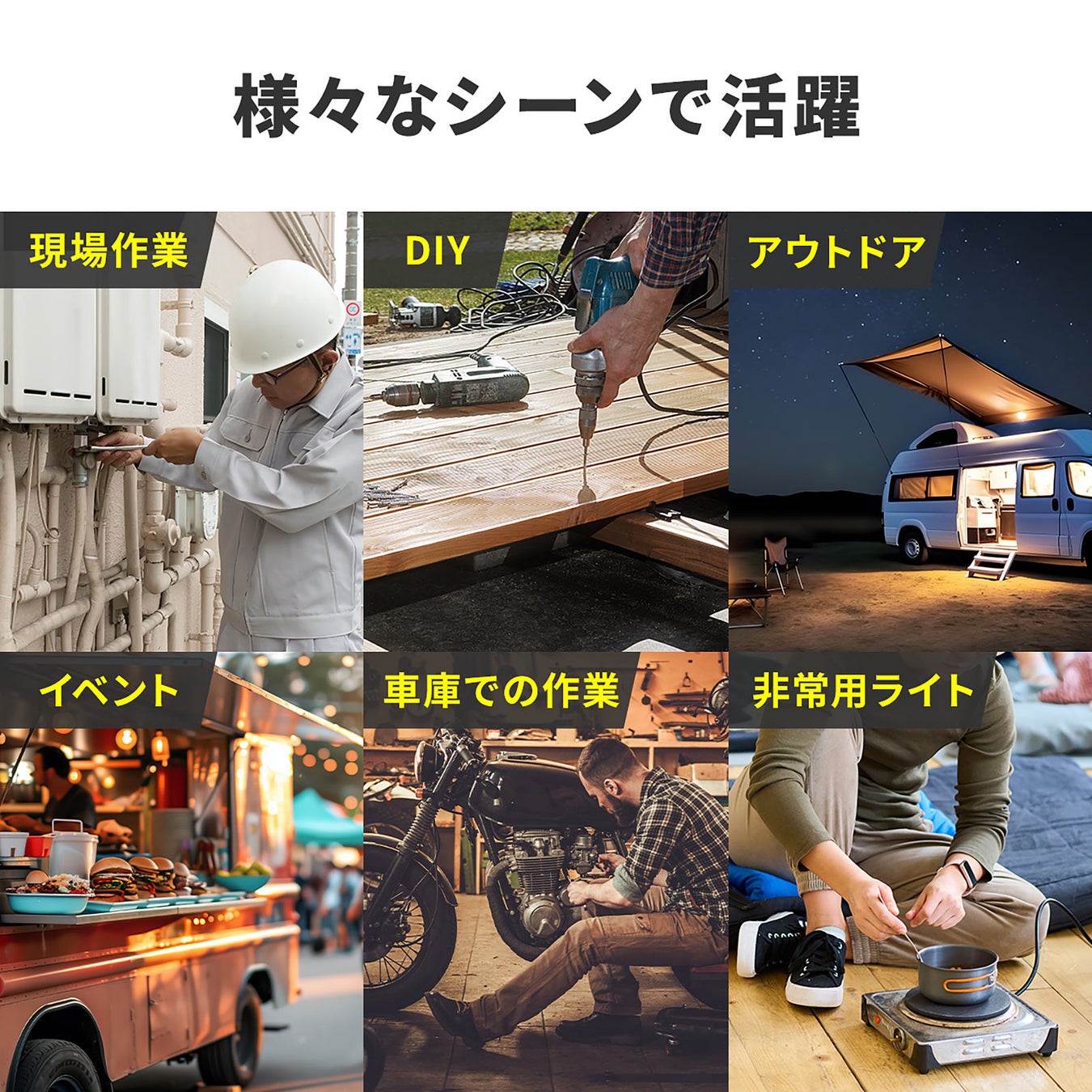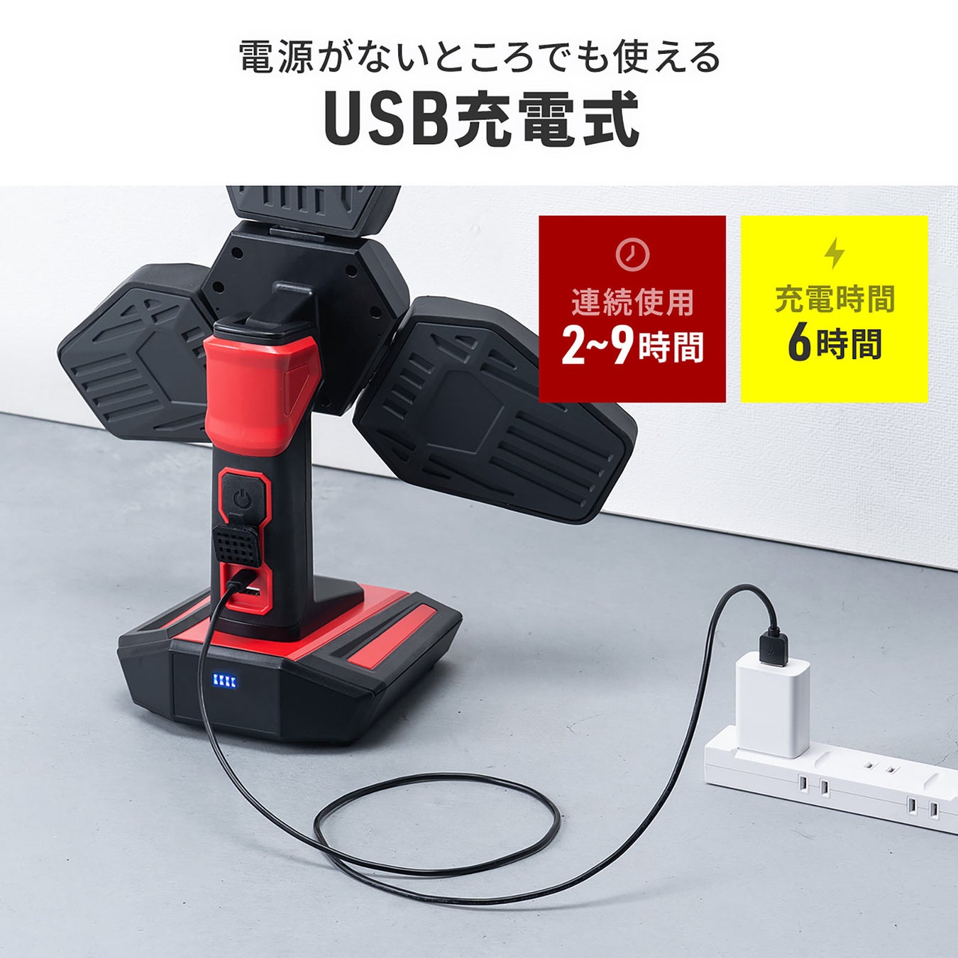 本製品はリチウムイオンバッテリーを内蔵し、最大9時間の連続使用が可能。キャンプや工事現場、災害時の停電など、電源のない環境でも大活躍。USB充電式で、移動中の充電も手軽に行えます。