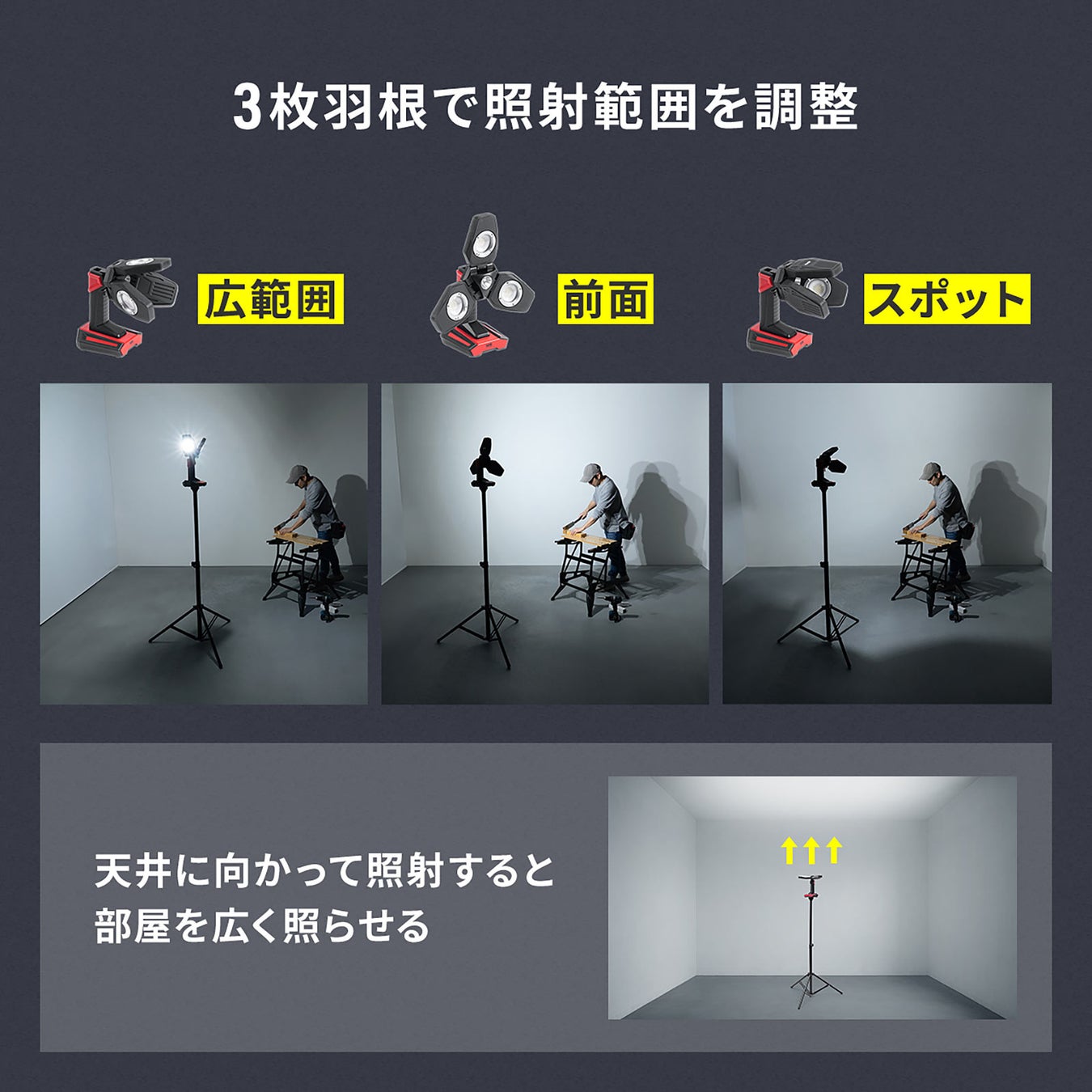 付属の三脚で高所からの照射も可能。地面にそのまま置いたり、フックで吊り下げたり、設置スタイルは自由自在。現場やシーンに応じて最適な照明ポジションを選べます。