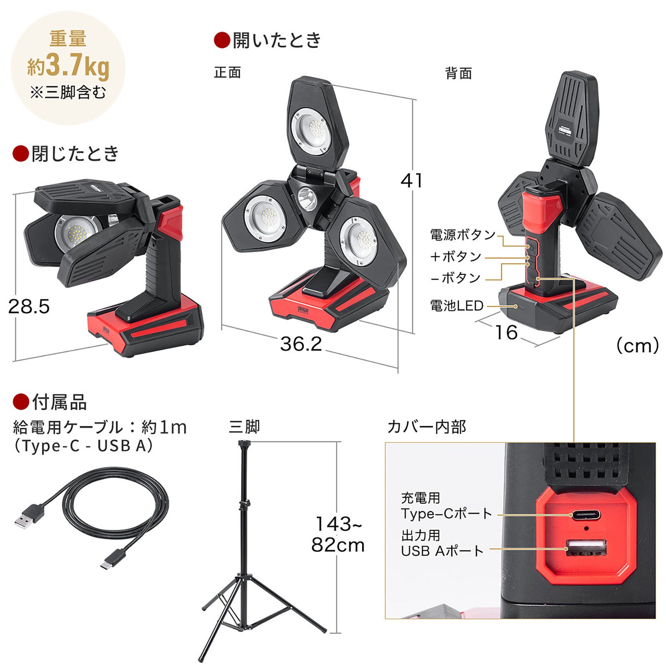 投光器 作業灯 ワークライト LED 3500ルーメン フラッドライト 高輝度 充電式 屋外用 三脚付き