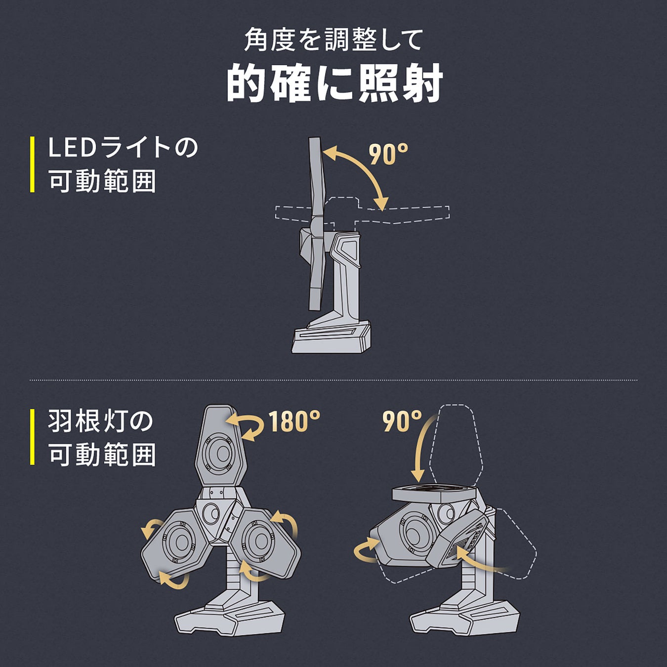 羽根灯と中央灯の合計で最大3500ルーメンを実現し、夜間の作業や暗所での作業を力強くサポート。LEDならではの瞬時点灯と高演色性により、手元がくっきり見える快適な照明環境がつくれます。