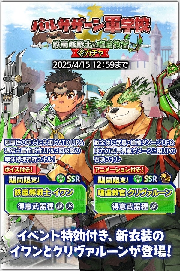 さらに、SSR魂友「鉄嵐熊戦士 イワン」とSSR神器「嗜虐教官 クリヴァルーン」が入手可能な期間限定の「バルサザーン軍学校ー鉄嵐熊戦士と嗜虐教官」ガチャも登場!