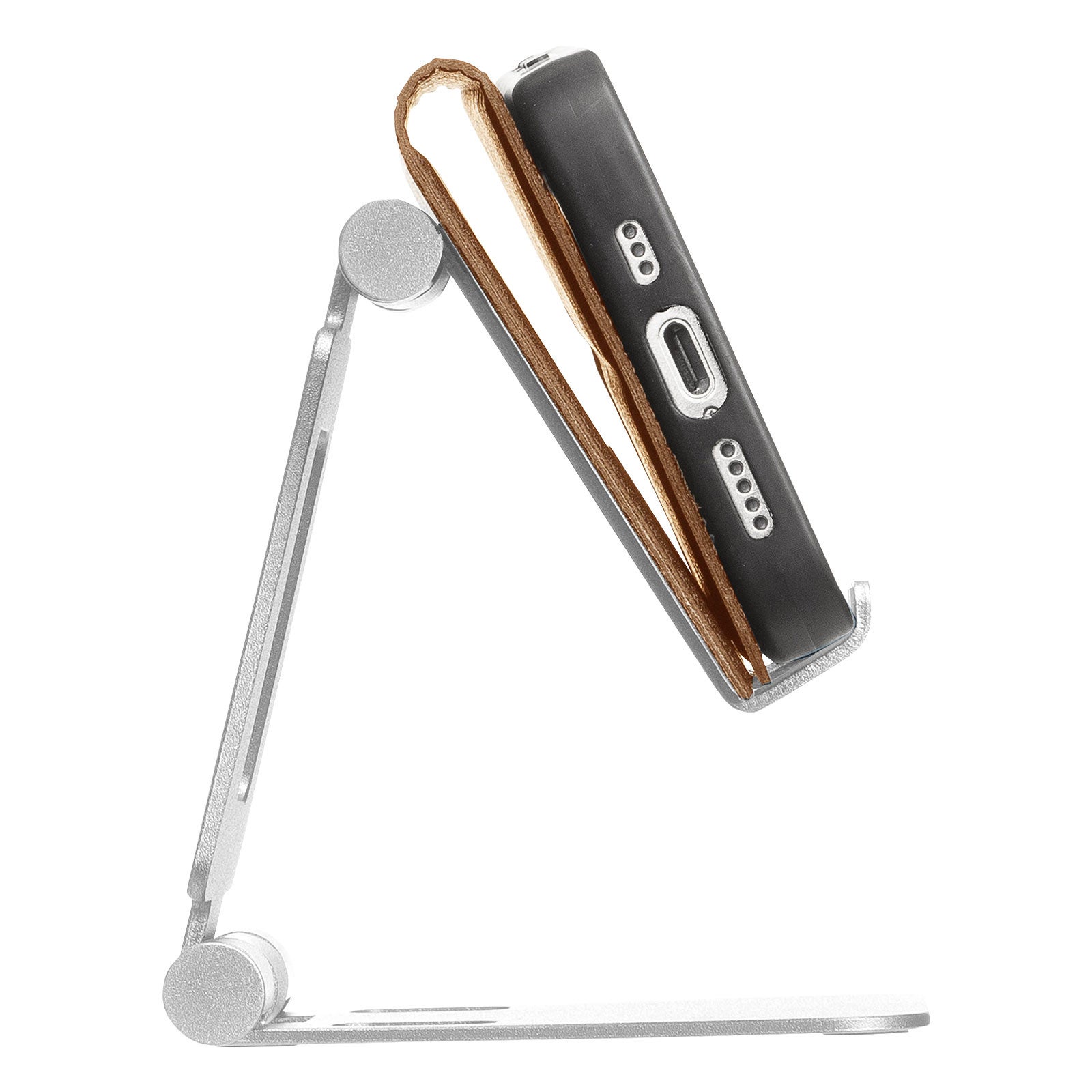 接触部分にはキズ防止ゴムパッド、底面には滑り止めラバーを採用。スマートフォンをしっかり守りつつ、タップ操作でもズレずに安定。高品質アルミ素材の重厚感も、安心感をさらにプラスします。