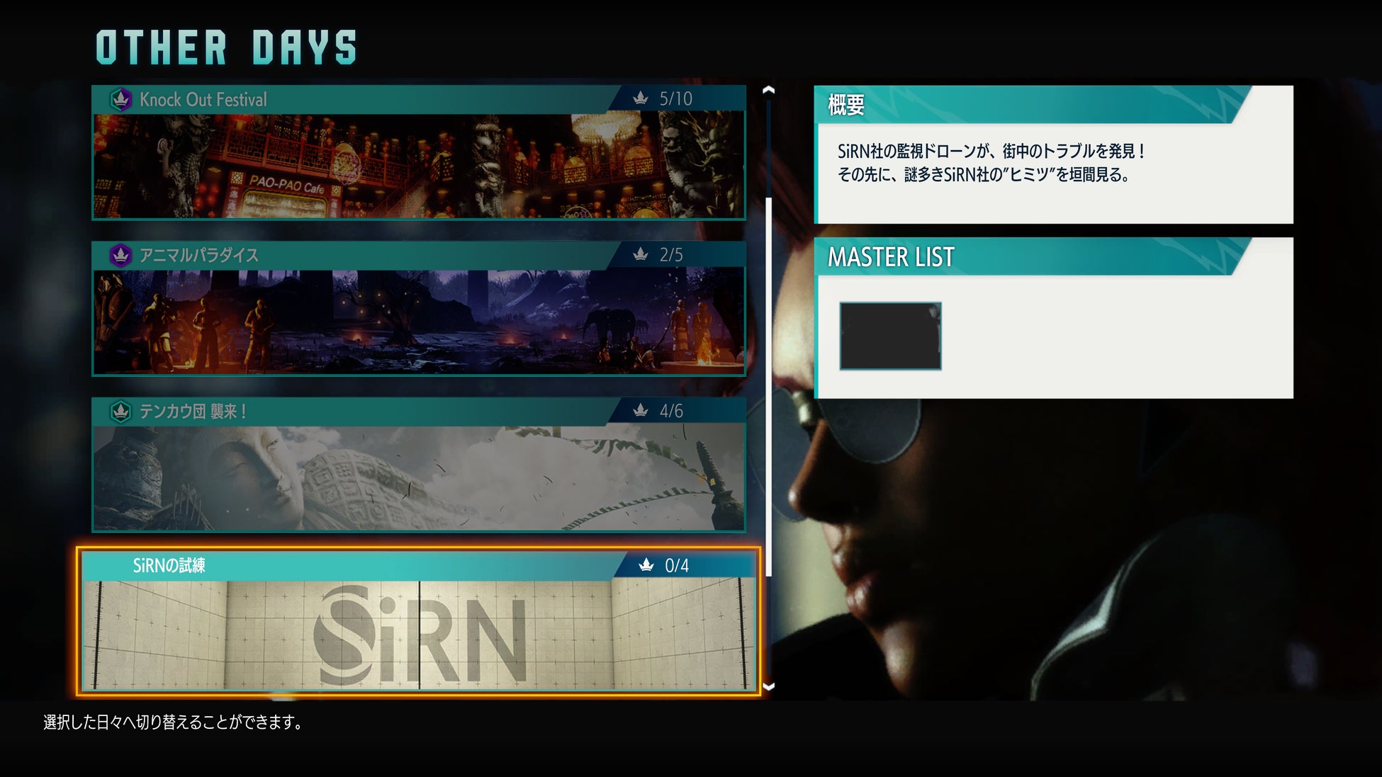 ②“OTHER DAYS”メニューに追加される「SiRNの試練」をチェックする。