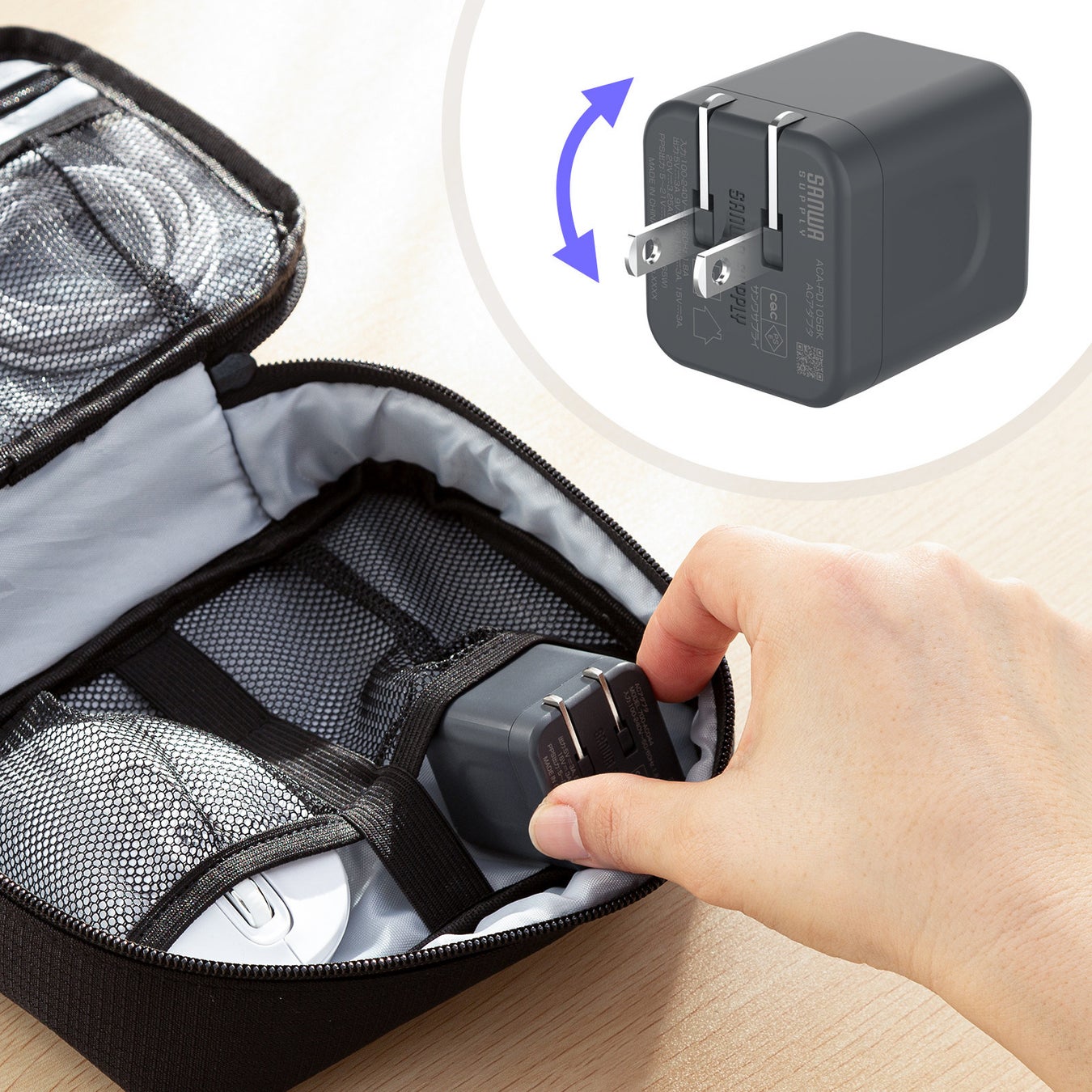 90°回転するプラグを採用し、折りたたんで収納できます。持ち運びの際にコンパクトになり、周りの機器を傷つけにくくなります。