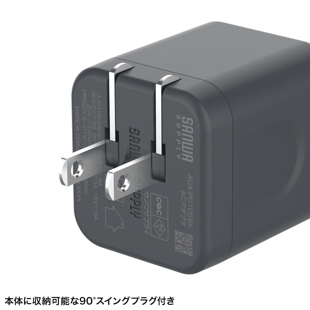 サンワサプライ株式会社(本社:岡山市北区田町1-10-1、代表取締役社長 山田和範)は、次世代半導体GaNを採用した高効率かつコンパクトなUSB Type-C対応ACアダプタ「ACA-PD105BK」を発売しました。