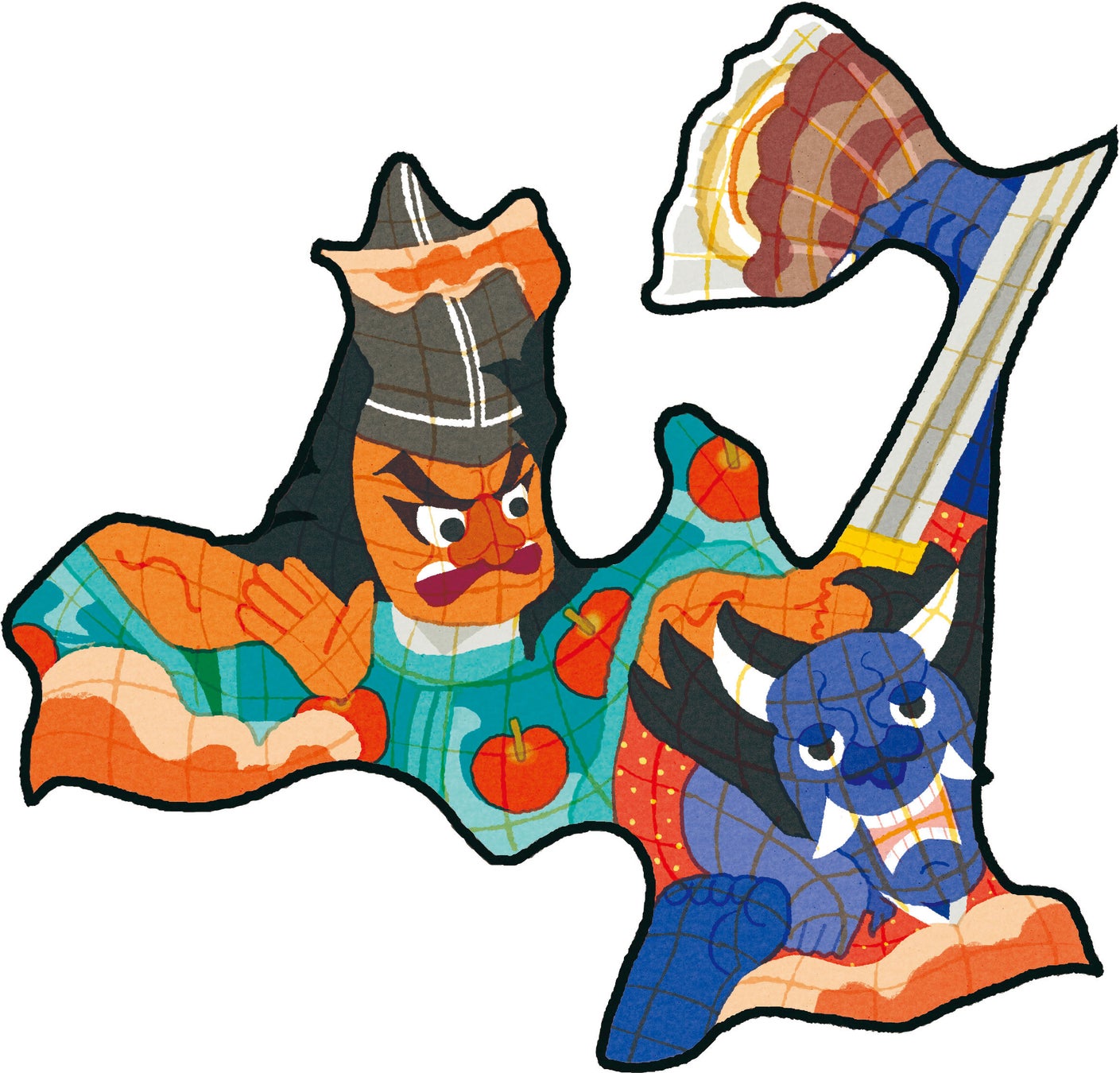 ・問題1……青森県(下北半島&津軽半島2つの半島の形が特徴的な青森県。ねぶた祭の山車が描かれていますが、よく見ると名産品のりんごとほたてもあります!)
