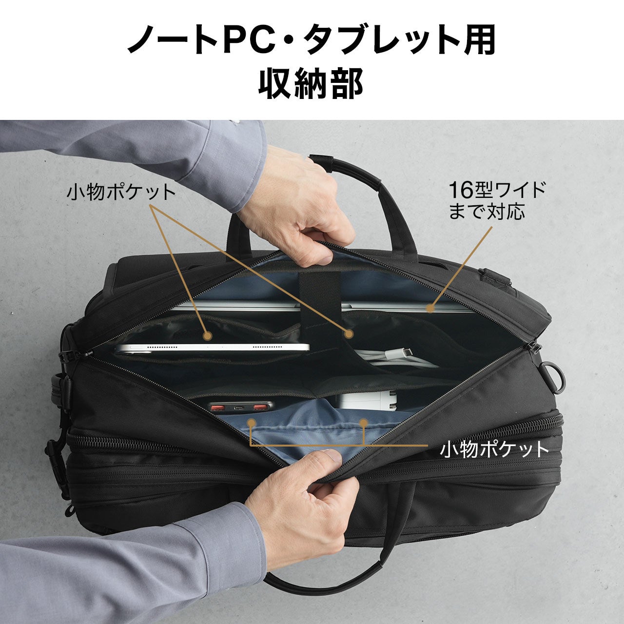 ●ノートPC・タブレット収納部は、16インチまでのノートPCやタブレットを収納でき、不意な飛び出しを防ぐベルトとクッションで機器を保護して持ち運べます。