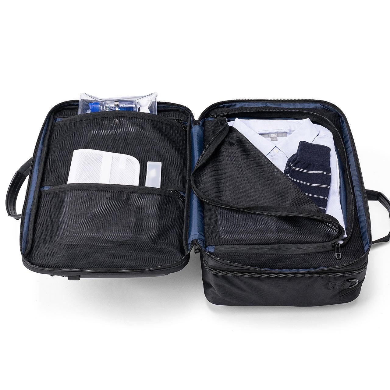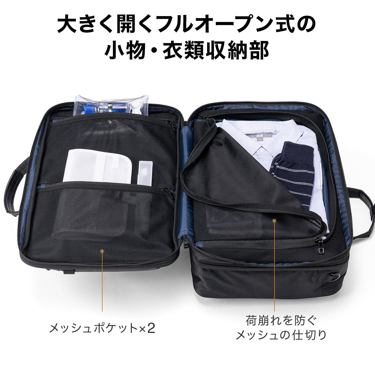 ・キャリーケースのように大きく開くフルオープン式で、メッシュの仕切りで荷崩れを防ぐ構造