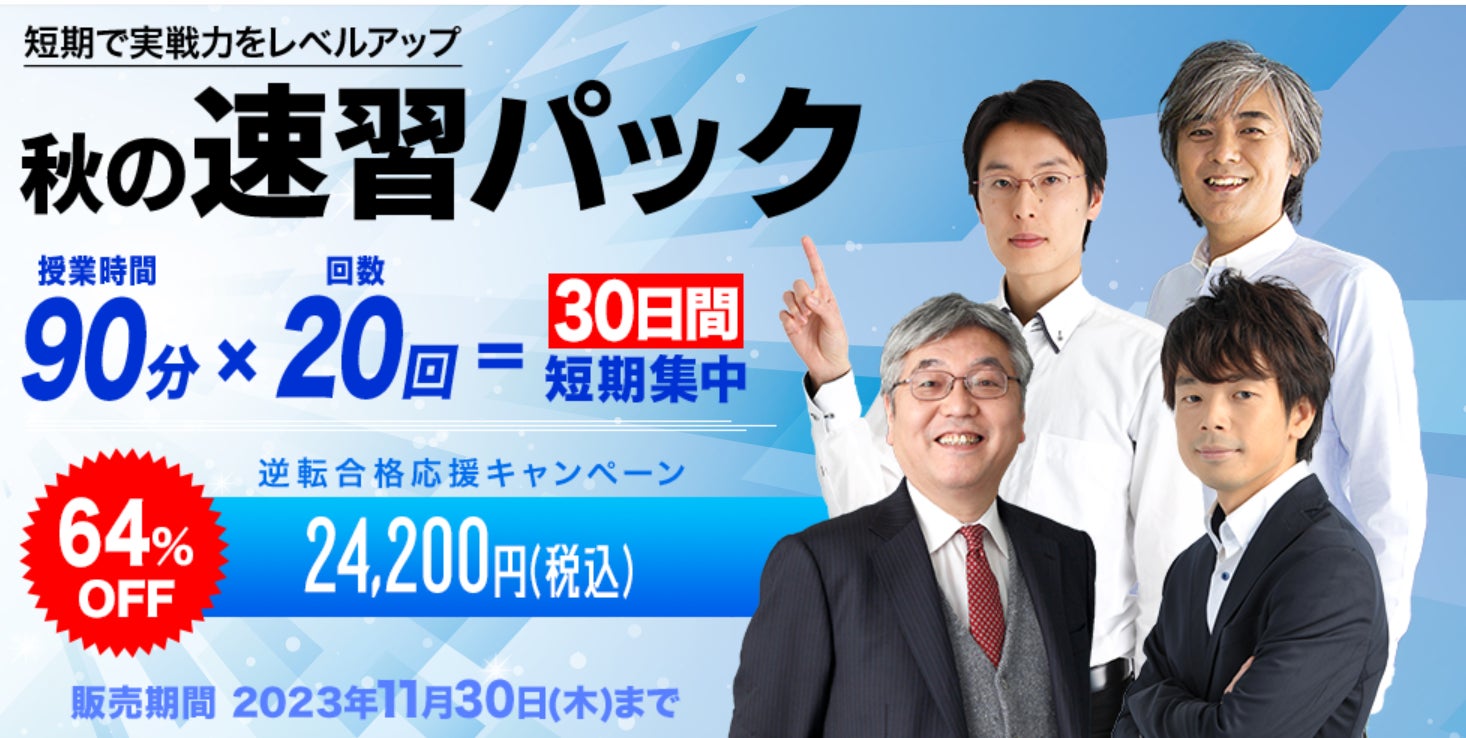 「秋の速習パック」は、この時期に受験対策のメインとなる問題演習を中心とする講座を、科目別にパッケージ。受講期限30日で効率的に「速習」する講座構成となっています。受験生応援キャンペーンのため価格も64%OFFと大幅にプライスダウンし、取り組みやすい特別価格でご提供いたします。