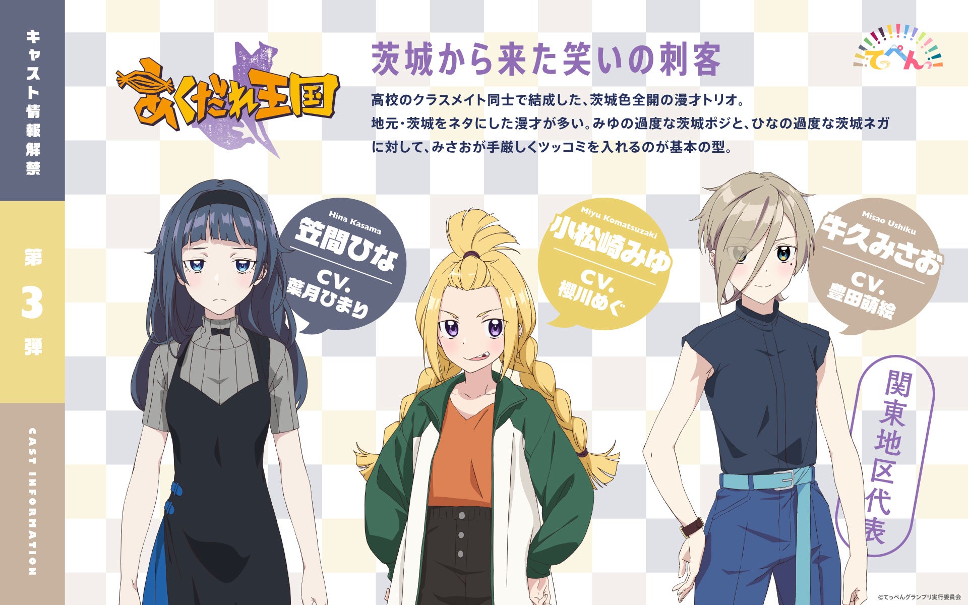 2022年放送予定のオリジナルTVアニメ『てっぺんっ!!!!!!!!!!!!!!!』新規お笑いトリオ&キャスト発表、その名も関東地区代表「あくだれ王国」!