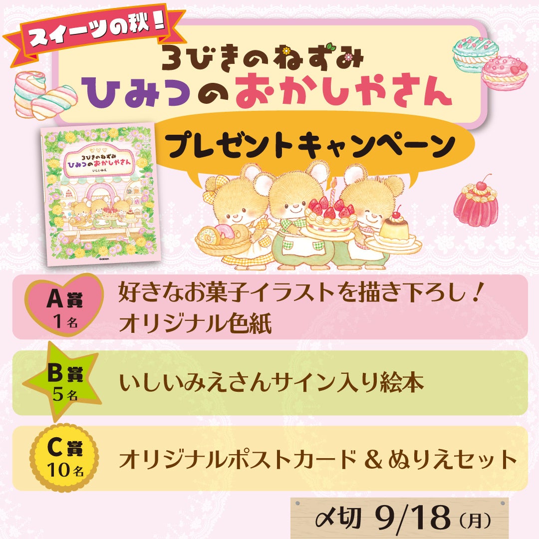 絵本『3びきのねずみ ひみつのおかしやさん』のプレゼントキャンペーンをX(旧Twitter)とInstagramで開催します。