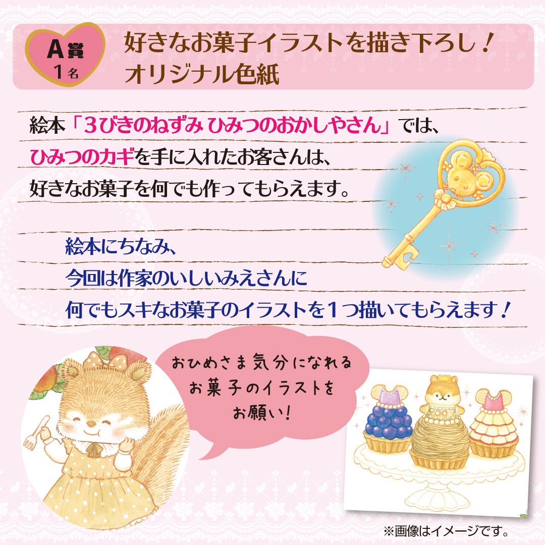 絵本にちなみ、A賞は作家のいしいみえさんに何でも好きなお菓子のイラストを1つ描いていただけます!