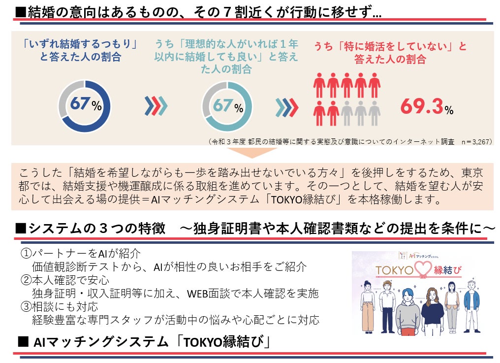 東京都では、「一人ひとりの多様な選択肢が叶えられる社会」の実現に向け、ライフステージを通じた切れ目ない支援を進めています。このたび、価値観テストなどに基づき交際が成立する可能性の高い相手を紹介するAIマッチングシステム「 TOKYO縁結び」を9月20日(金曜日)よりスタートします。