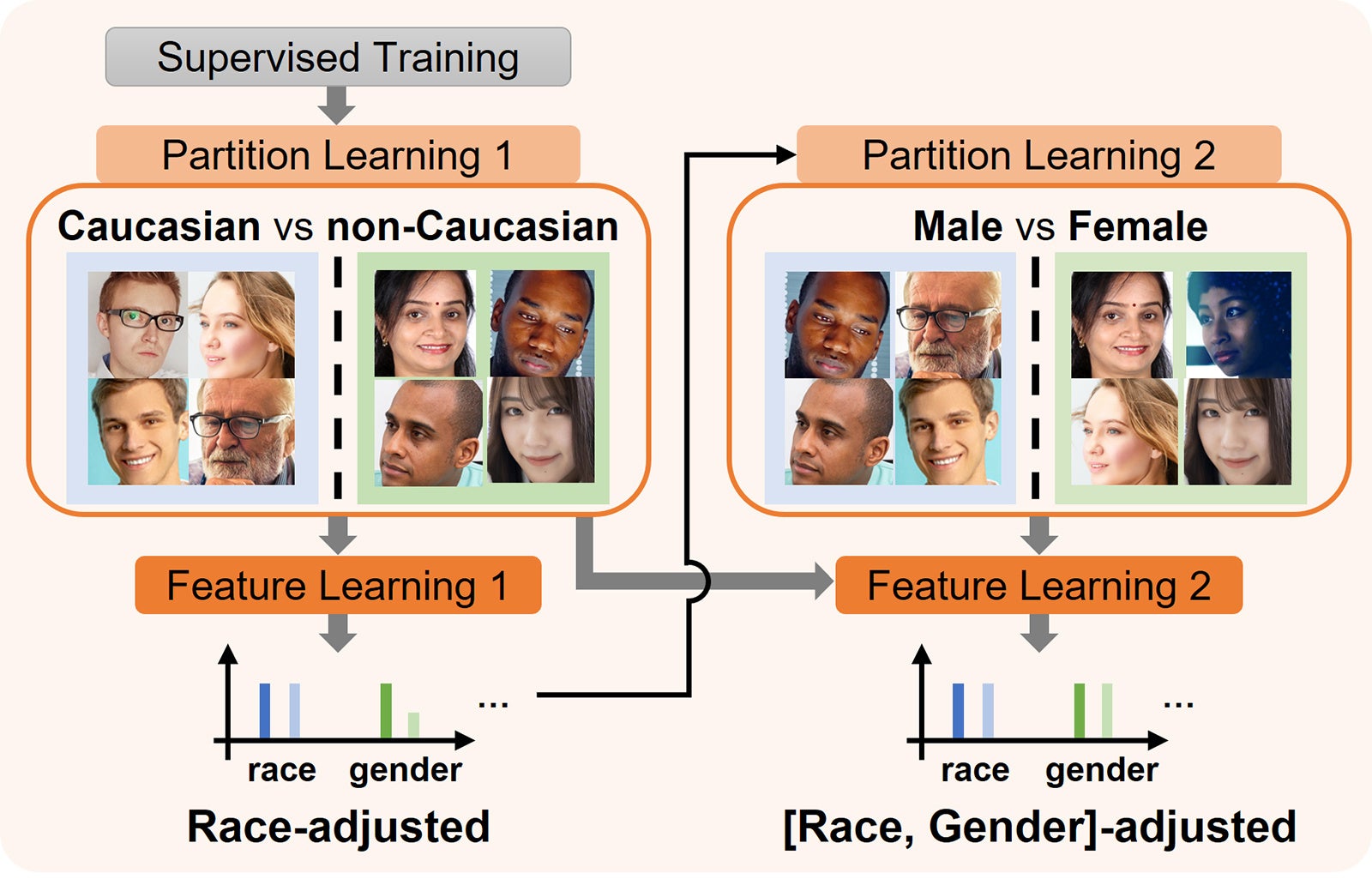 一般的に、顔認証技術は、データ数の少ない属性(特定の人種、女性など)について、認証精度が低下する傾向にありました。この度採択された論文「Invariant Feature Regularization for Fair Face Recognition」では、本問題に対し、ディープラーニングにおける「パーティション学習」という手法を初めて(※4)顔認証に適用しました。この技術を用いて種々の属性に共通して有効となる顔認証モデルを学習することで、データ数が少ない特定の人種や女性の認証精度の低下を抑制することに成功しました。人種や性別に起因する認証エラーは広く問題視されておりますが、本技術はそういった問題の解決にも寄与できると考えております。