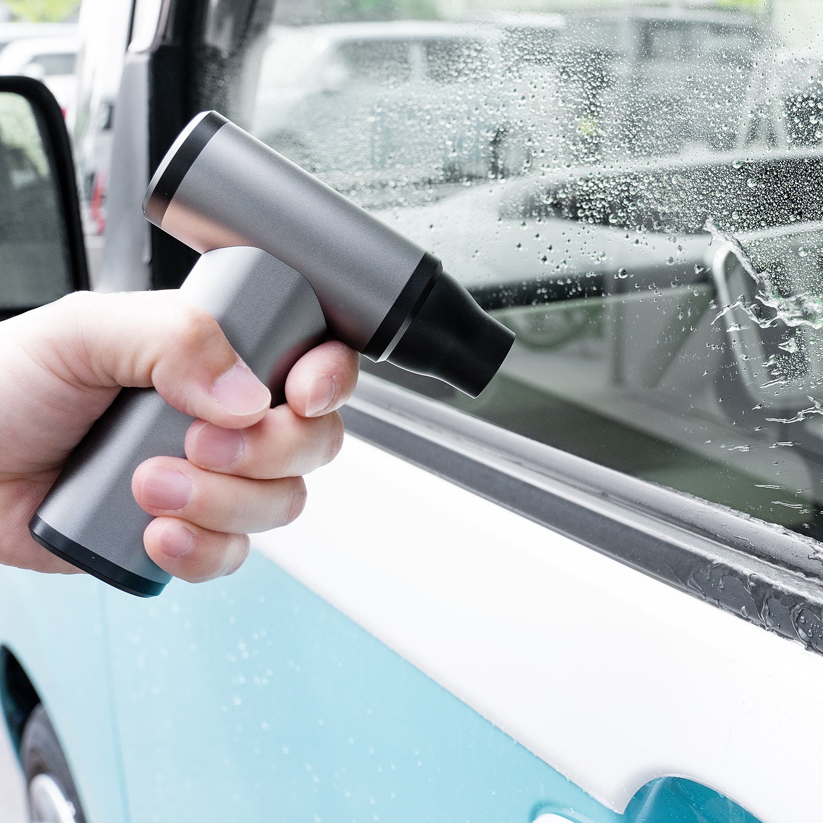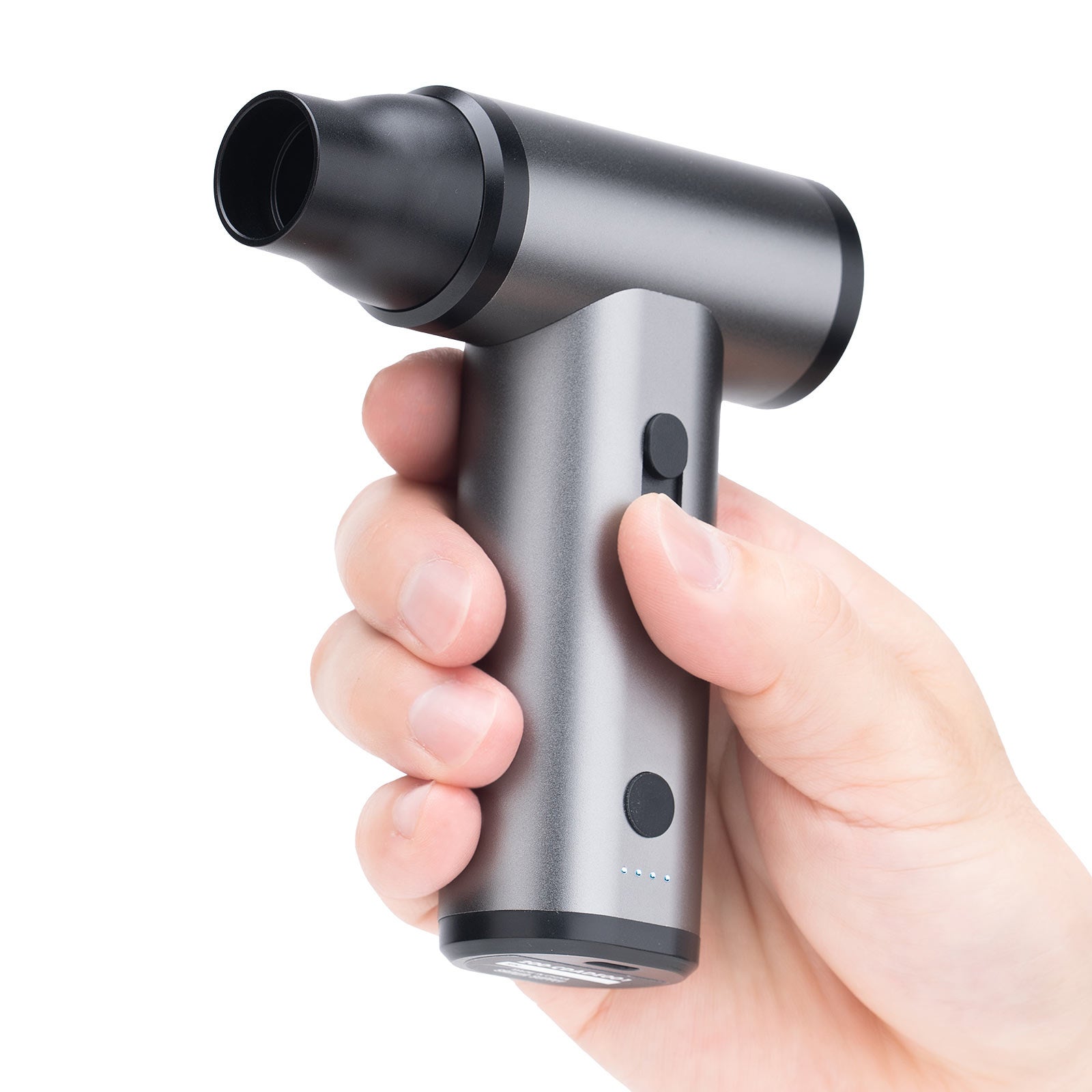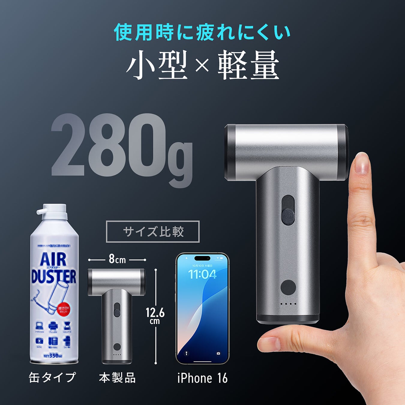 本体は高級感のあるアルミ素材を採用。耐久性と放熱性を兼ね備えています。また本体重量は280gと軽量で、iPhone16よりもコンパクトです。収納はもちろん、持ち運びも簡単な電動エアダスターです。