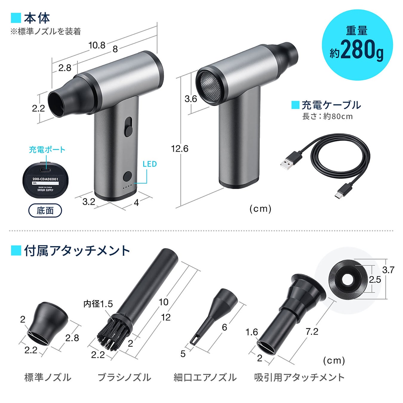 小型ながら最大風速30m/sでホコリやゴミを吹き飛ばすことができ、風量は無段階で調整が行え、4種類のアタッチメントを付け変えて使える電動エアダスター