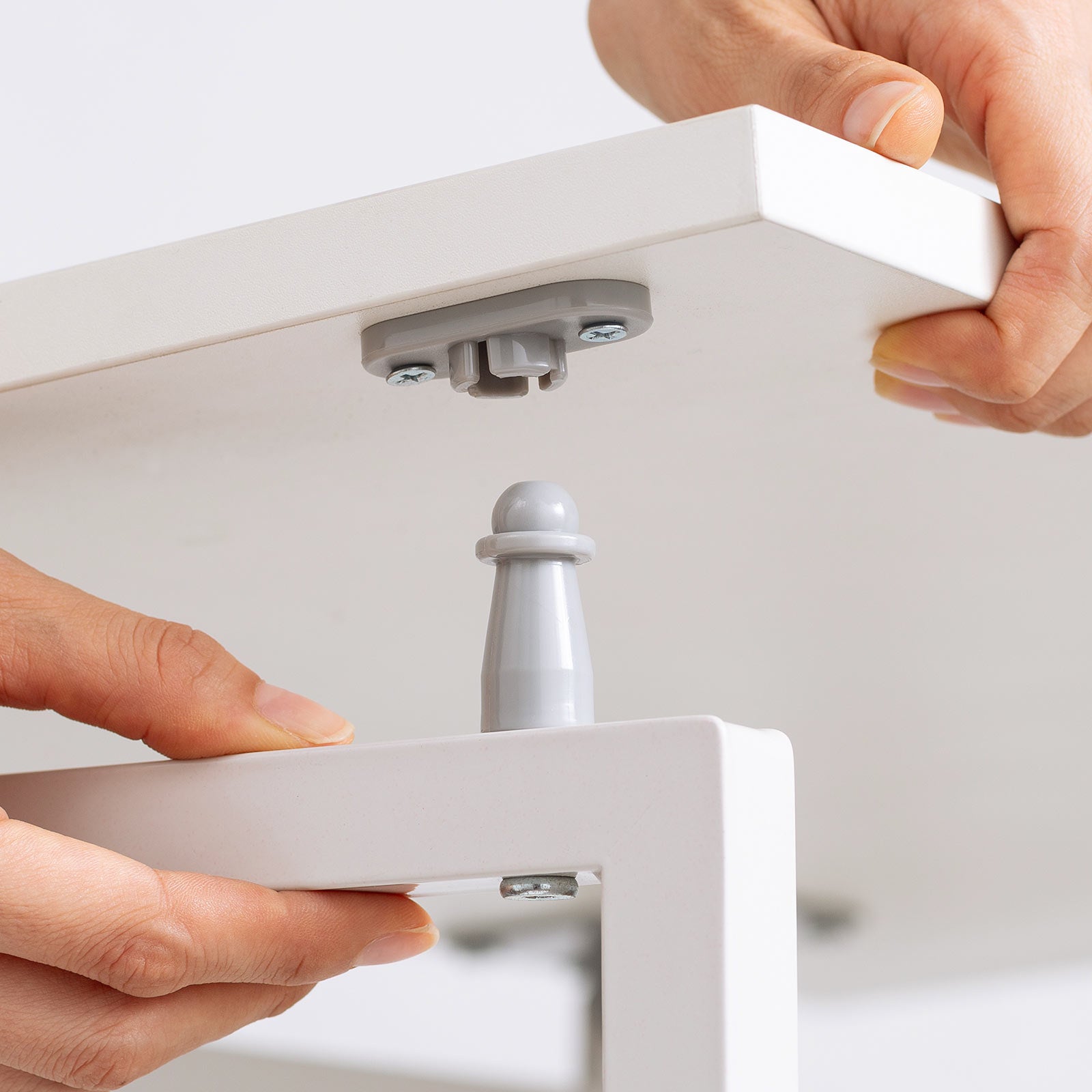 見た目は軽やかでも、耐荷重はしっかり20kg。重たい書籍やデバイスを置いても安心して使えます。また、天板には汚れに強いメラミン化粧板を採用しており、サッと拭くだけで清潔さをキープ。日々の使いやすさに配慮しています。