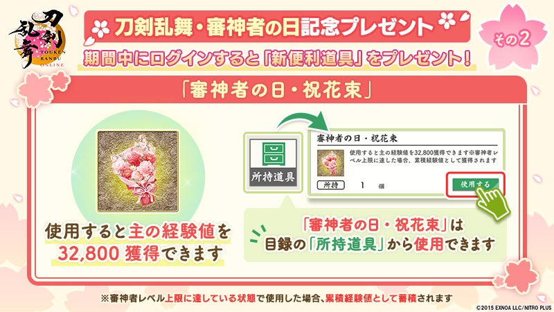 期間中、ゲームにログインした全ユーザーを対象に、新便利道具「審神者の日・祝花束」「気力+30バー」や、「御伴撮影」機能で使用できる「フレーム」「写真スタンプ」が贈られる「刀剣乱舞・審神者の日記念ログインプレゼント」を実施いたします。