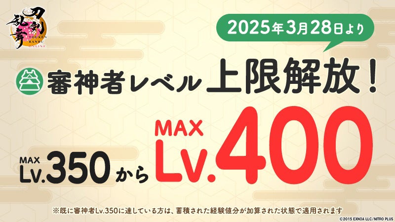 2025年3月28日(金)のメンテナンス後より、審神者レベルの上限を「Lv.350」から「Lv.400」へ変更いたしました。