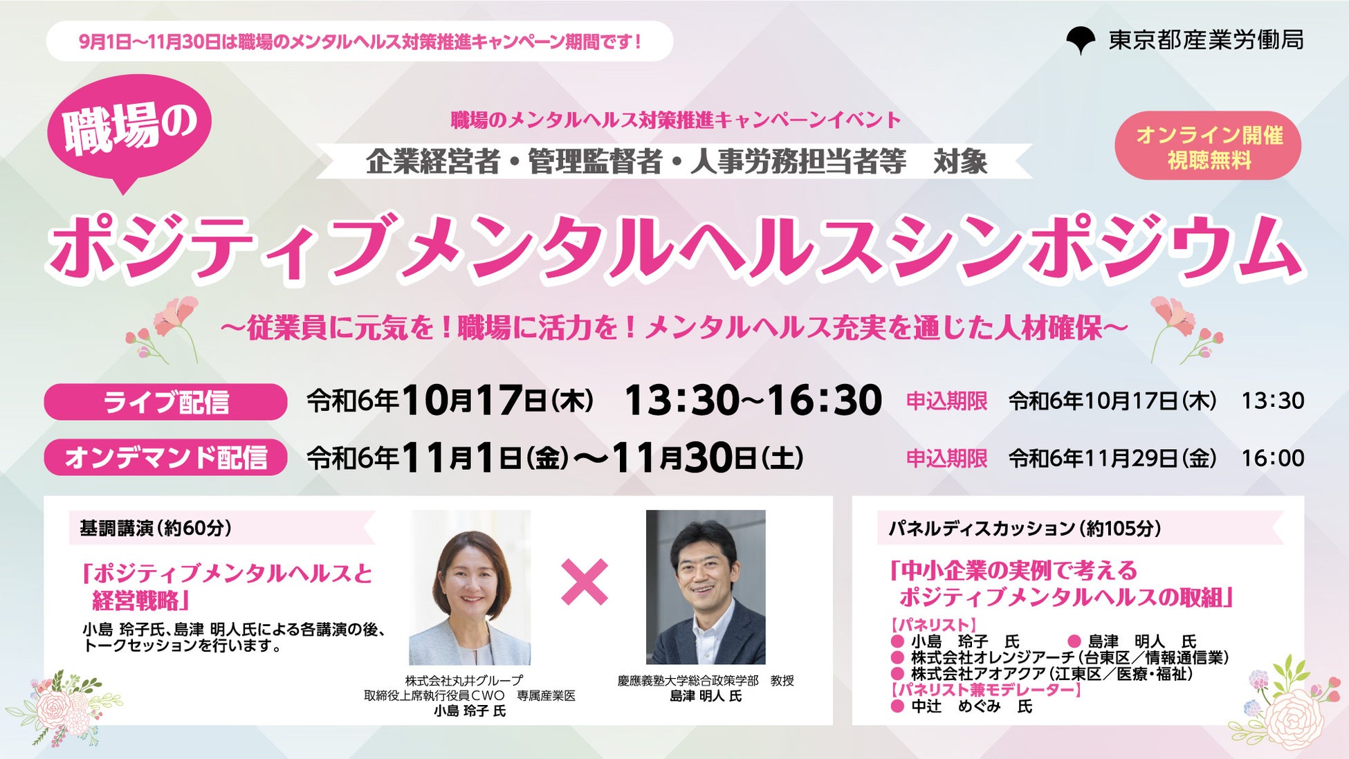 心身ともに健康に、いきいきと充実して働くことを通じて組織の活性化、生産性の向上につなげていく “ポジティブメンタルヘルス” の考え方をテーマに、シンポジウムを開催します。