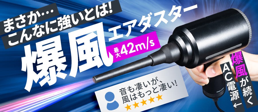 本製品はAC電源で使用でき、連続使用15分使用できる電動エアダスター。手元スイッチで2段階風速調整が可能で、場所に合わせて選べるノズル3種付き。