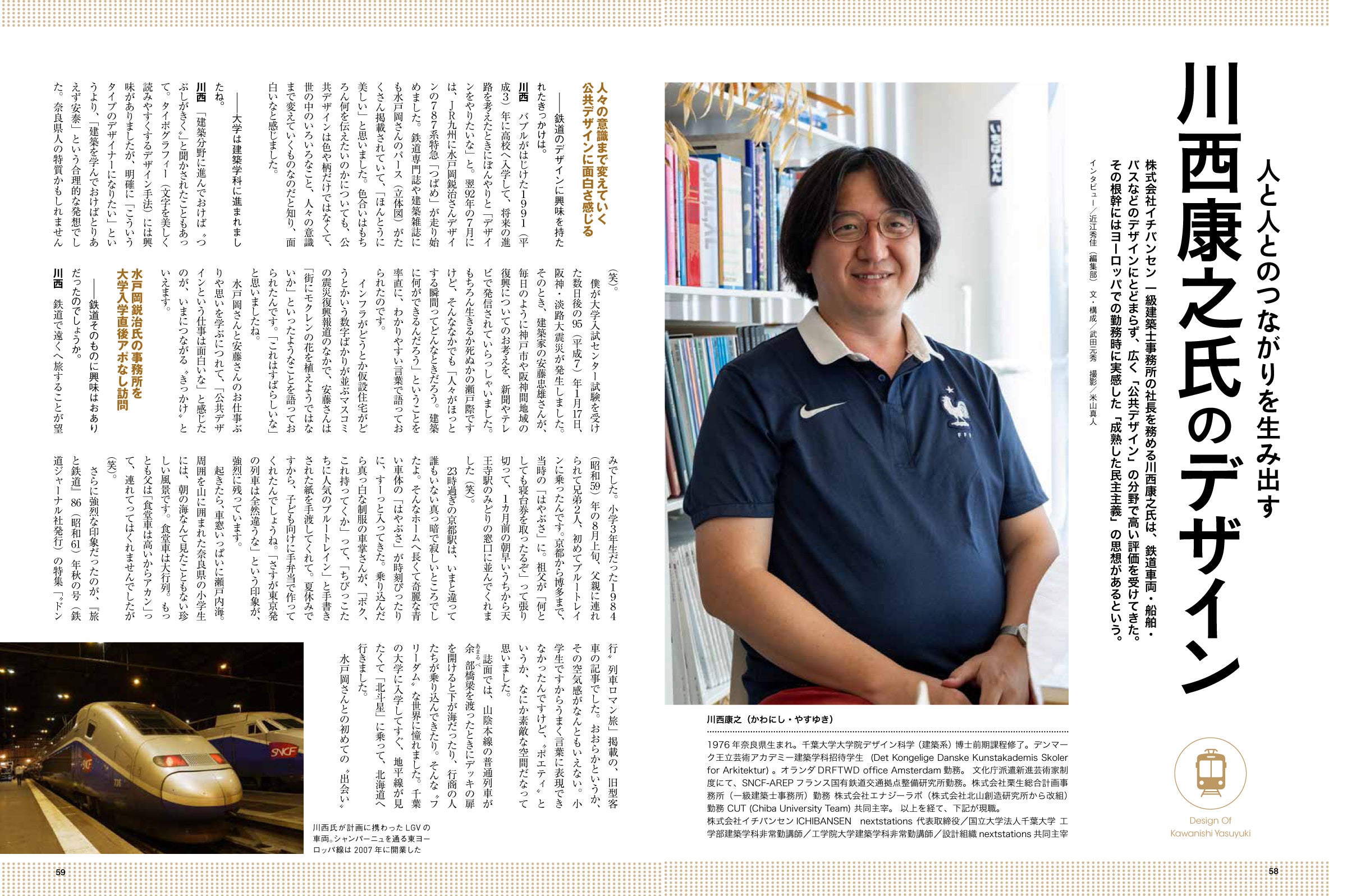 えちごトキめき鉄道の「えちごトキめきリゾート雪月花」やJR西日本の「WEST EXPRESS 銀河」、2024年デビュー予定の273系特急「やくも」などのデザイナーである川西康之氏にインタビュー。鉄道の世界におけるデザインについて、気になる車両のデザインコンセプトのほか、学生時代にアポなしで水戸岡鋭治氏を訪問した逸話などもお伺いしています。