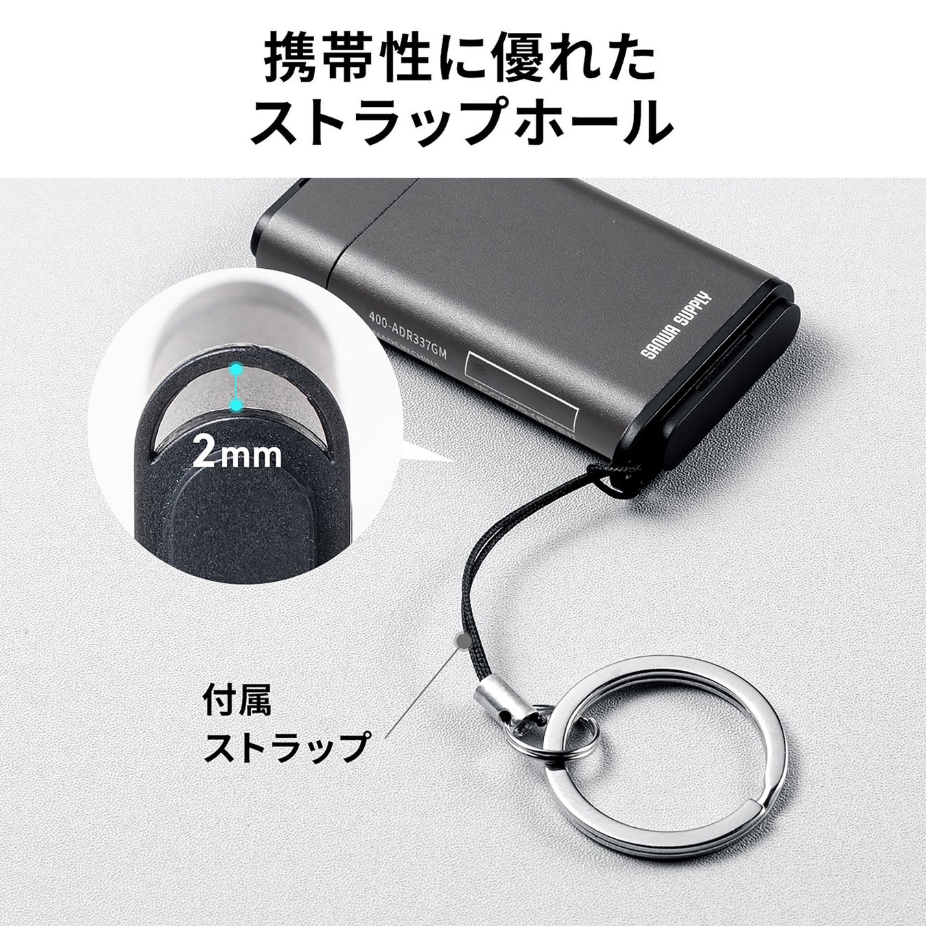 本体は約W5.6×D3×H1cm、重さ約18gと超コンパクト設計。付属のストラップとストラップホールで携帯性も抜群。ノマドワーカーや外出先での使用にぴったりなポータビリティを備えています。