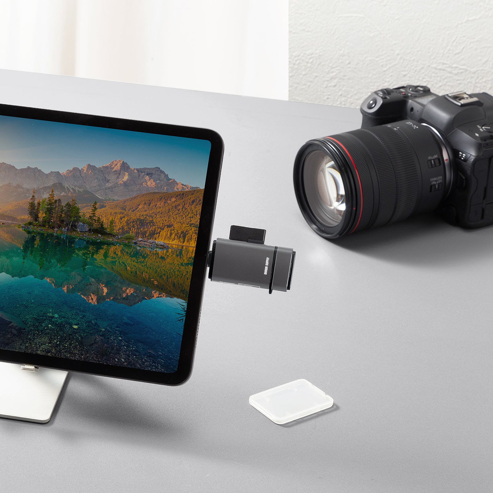 2スロット搭載で、SDカードとmicroSDカードを同時に読み書き可能。カード間のデータコピーや移動もストレスフリーで、複数メディアを扱う現場での作業効率を大幅に向上させます。