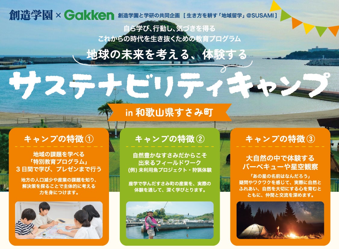自然豊かな和歌山県すさみ町の2023年3月廃校になった江住小学校を舞台に、創造学園(小中学習塾部門:エディック)と学研塾ホールディングスが共同で主催する「サステナビリティキャンプ」が、大成功に終わりました。