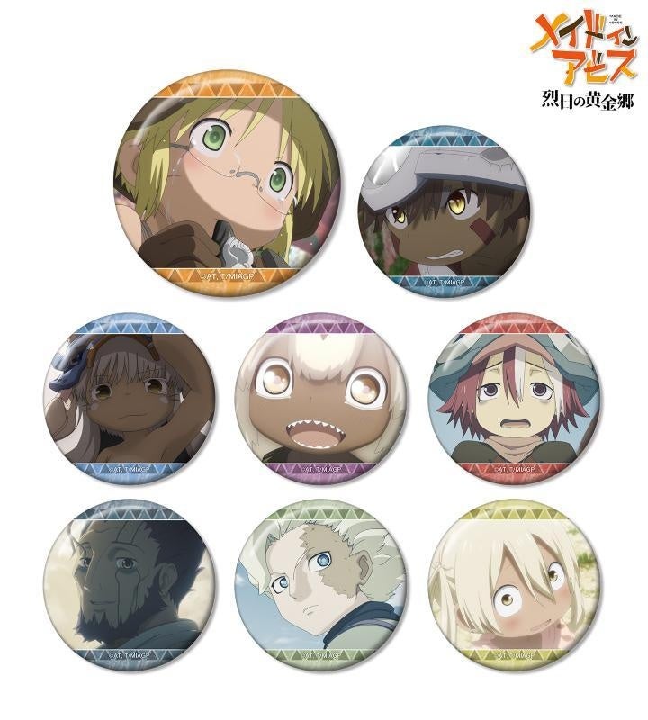 リコ、レグ、ナナチ、ファプタ、ヴエコ、ワズキャン、ベラフ、イルミューイの印象的なシーンを缶バッジに仕上げました。