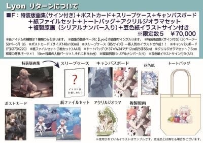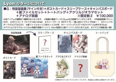 イラストレーター『Lyon』の作品の世界観を存分に知っていただけるよう、たくさんのイラストを詰め込んだ1冊となっております。また、リターンではB5判画集のほか、複製原画やアナログ原画もご用意させていただいております。