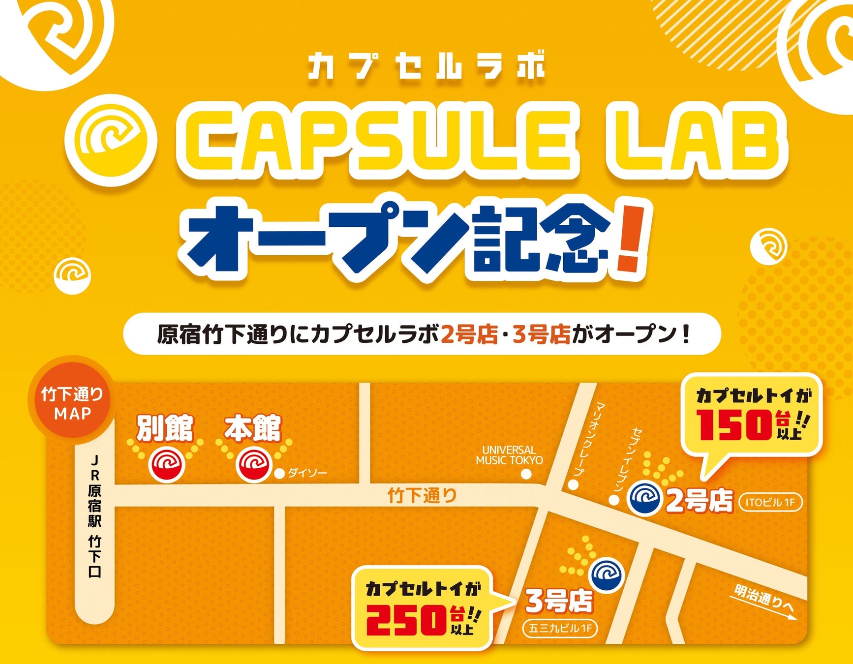 2023年12月にオープンした「カプセルラボ 原宿竹下通り」本館、2025年9月にオープンした別館に加え、今回新たに2号店・3号店を原宿・竹下通りに新規オープンいたしました。