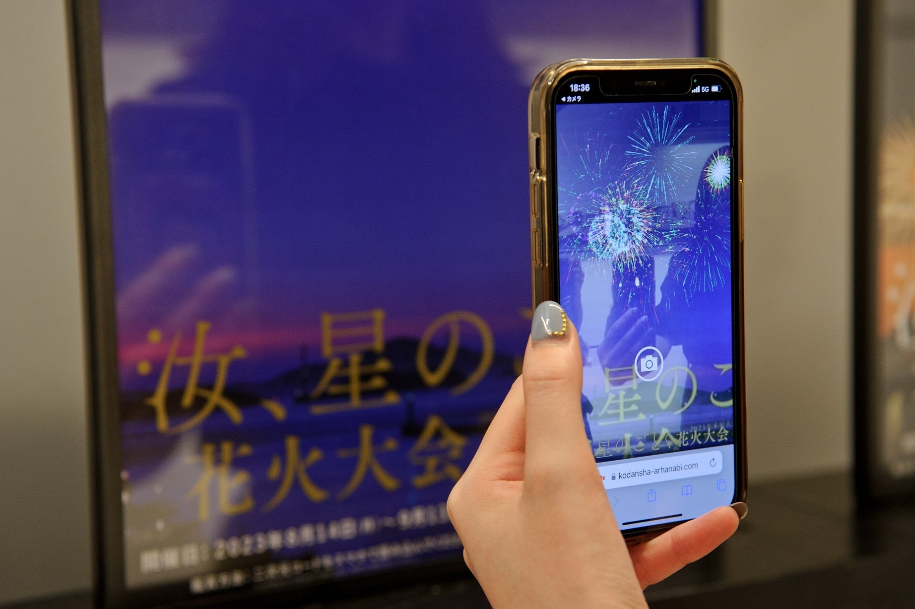 書店店頭のポスターにある二次元コードをスマホで読み込むと、書店の中で「花火」があがります。