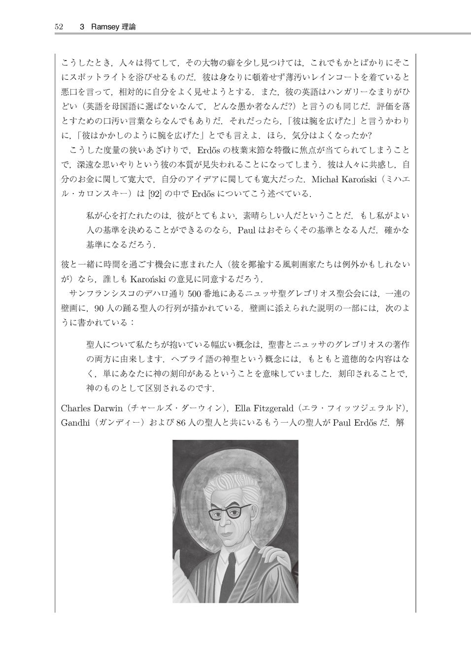 流浪の数学者エルデスは20世紀の最も優れた数学者のひとりであり、生涯1655編の論文を残しました。これらの業績は、未来永劫に亘って離散数学の分野で不滅でしょう。彼の定理は予備知識をほとんど必要とせず、深い洞察と直観があれば高校生でも理解できます。