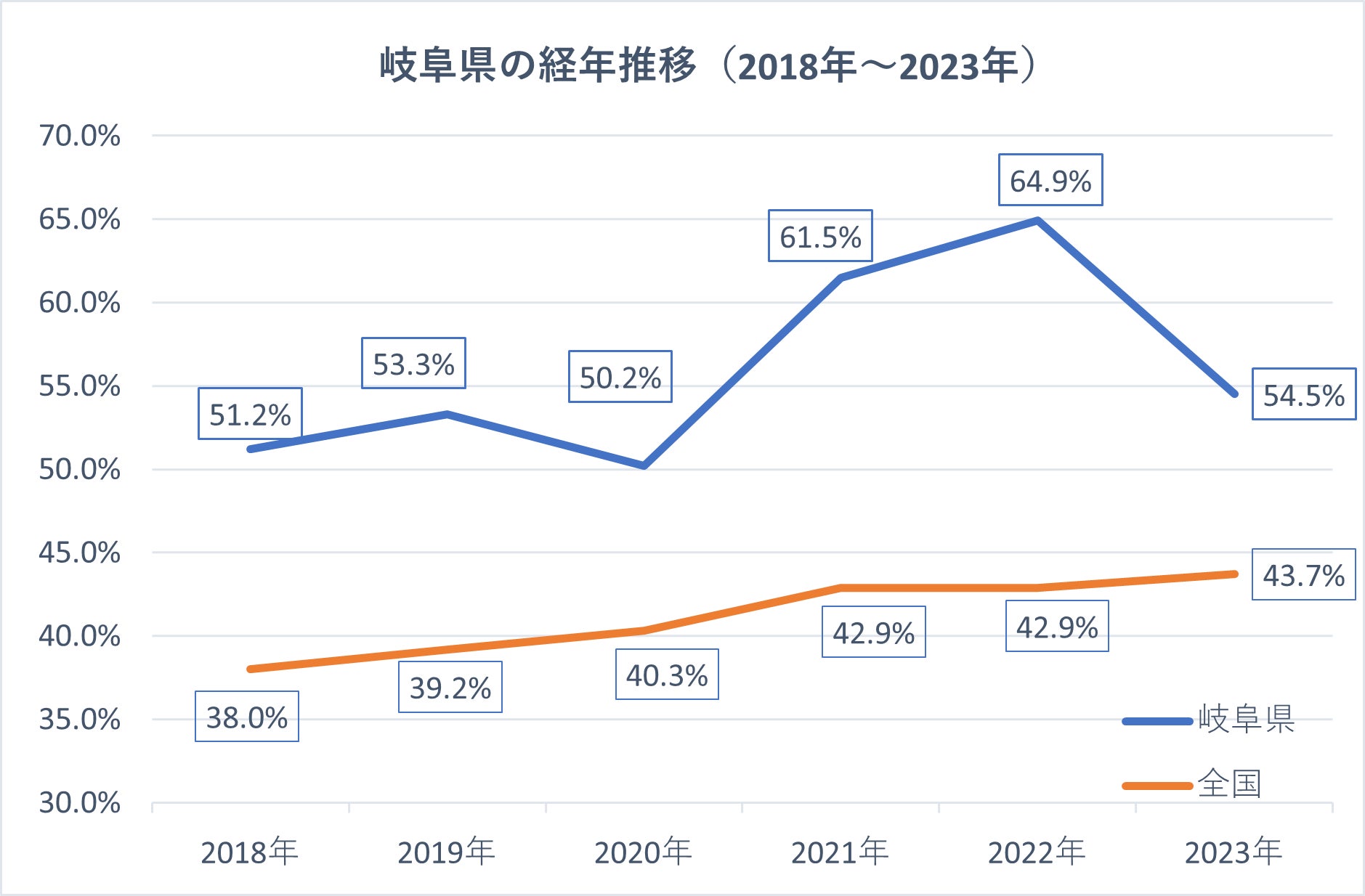 警察庁とJAFの合同調査による「2023年シートベルト着用状況全国況調査」では、岐阜県の後席シートベルト着用率は、一般道路54.5%で、これは2022年と比べると10.4ポイントも低くなりました(前年64.9%)。また、高速道路では85.4%(同77.9%)でした。全国平均は一般道路43.7%(前年42.9%)、高速道路78.7%(同78.0%)の結果でした。2008年に後席シートベルト着用が義務化されましたが、岐阜県は全国平均を上回っているものの、依然として運転席・助手席と比べると着用の意識が低いことを示しています。