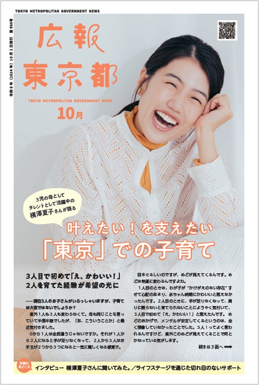 東京都では、都政や都民生活に必要な情報を伝えるため、広報紙「広報東京都」を毎月1日に発行しています。10 月号は「子育て」がテーマ。「叶えたい!を支えたい『東京』での子育て」と掲げ、望む人が安心して子供を産み育てることができるよう、東京都が行っているさまざまなサポートを紹介します。また、お笑いタレントであり、3児の母として東京都で子育てをされている横澤夏子さんへのインタビューも掲載。出産されてからの生活の変化や本当に助かったと思う行政サービスなど、ご自身の体験を交えながら、たくさんのお話を伺いました。