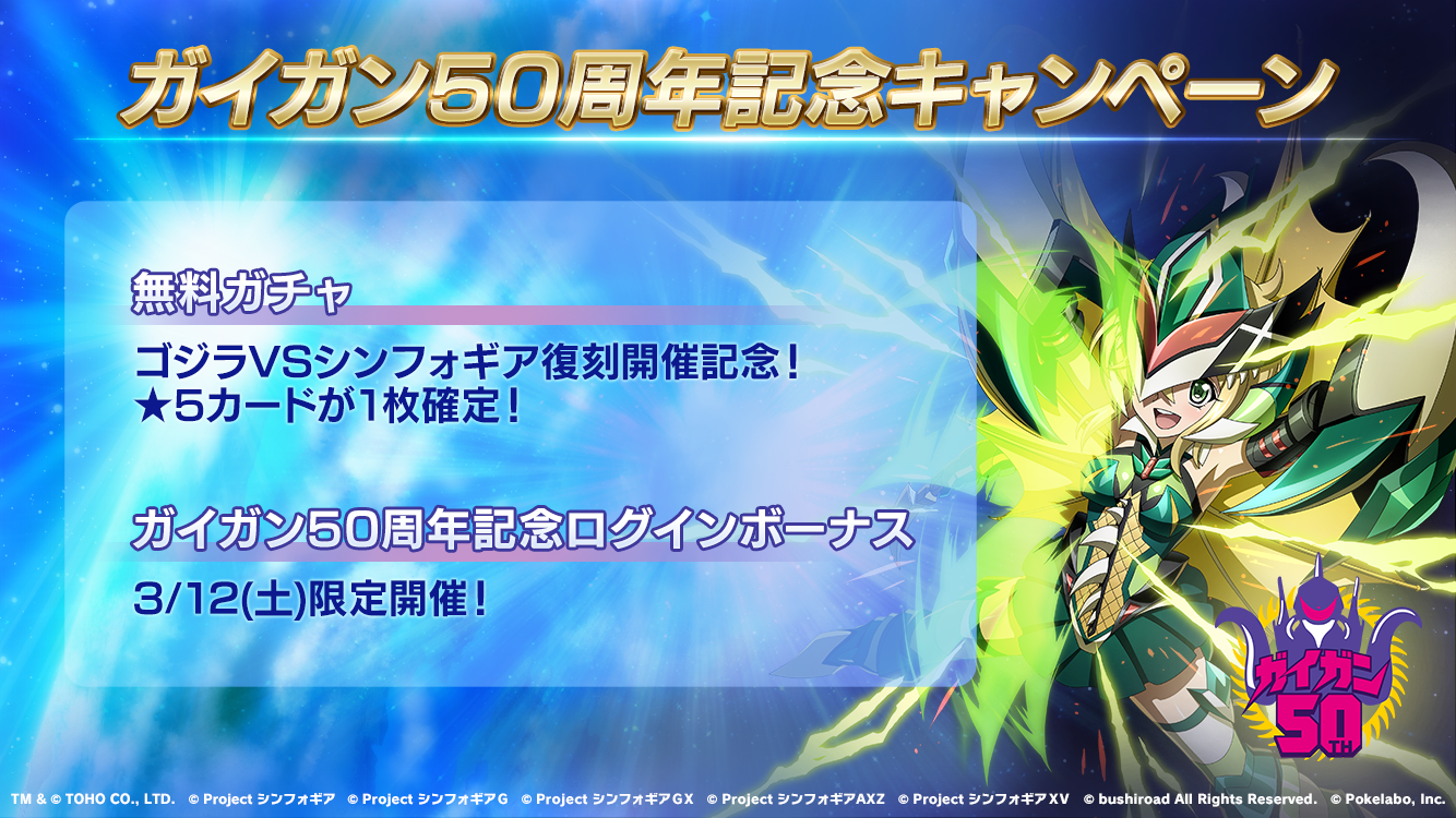 また、ガイガン50周年となる3月12日(土) 0:00~23:59には特別なログインボーナスを開催いたします。