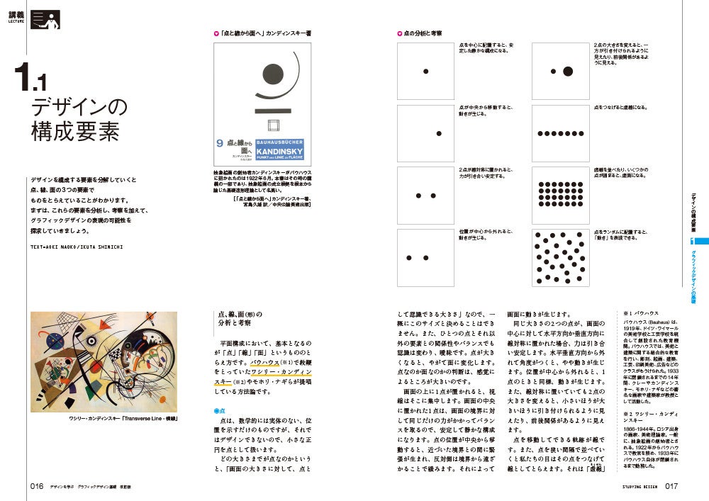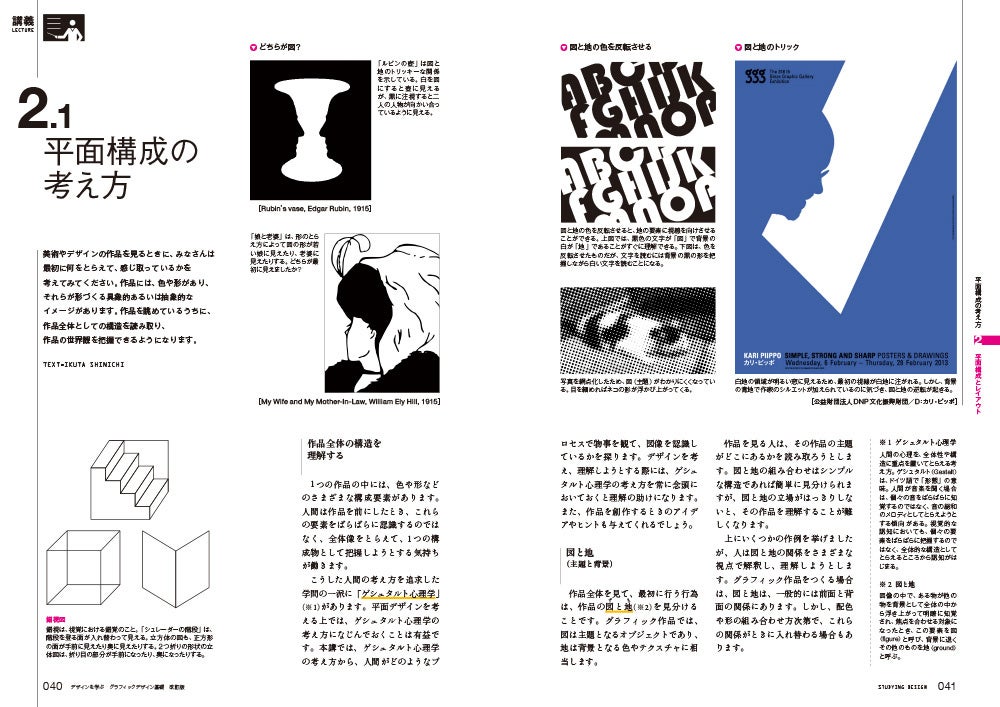 本書は「講義(=レクチャー)」と「演習(=エクササイズ)」で構成されており、「講義」では、専門学校や大学における課程で学ぶように、〈理論=セオリー〉を学習しながら〈技術=テクニック〉を磨き、優秀なデザイン〈作品〉を見ることで理解を深めます。さらに、自ら手を動かすことによって学習した内容が体験として身につくよう、各講義の終わりには「演習」が設けられています。