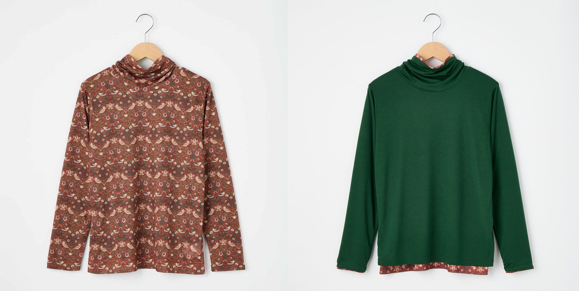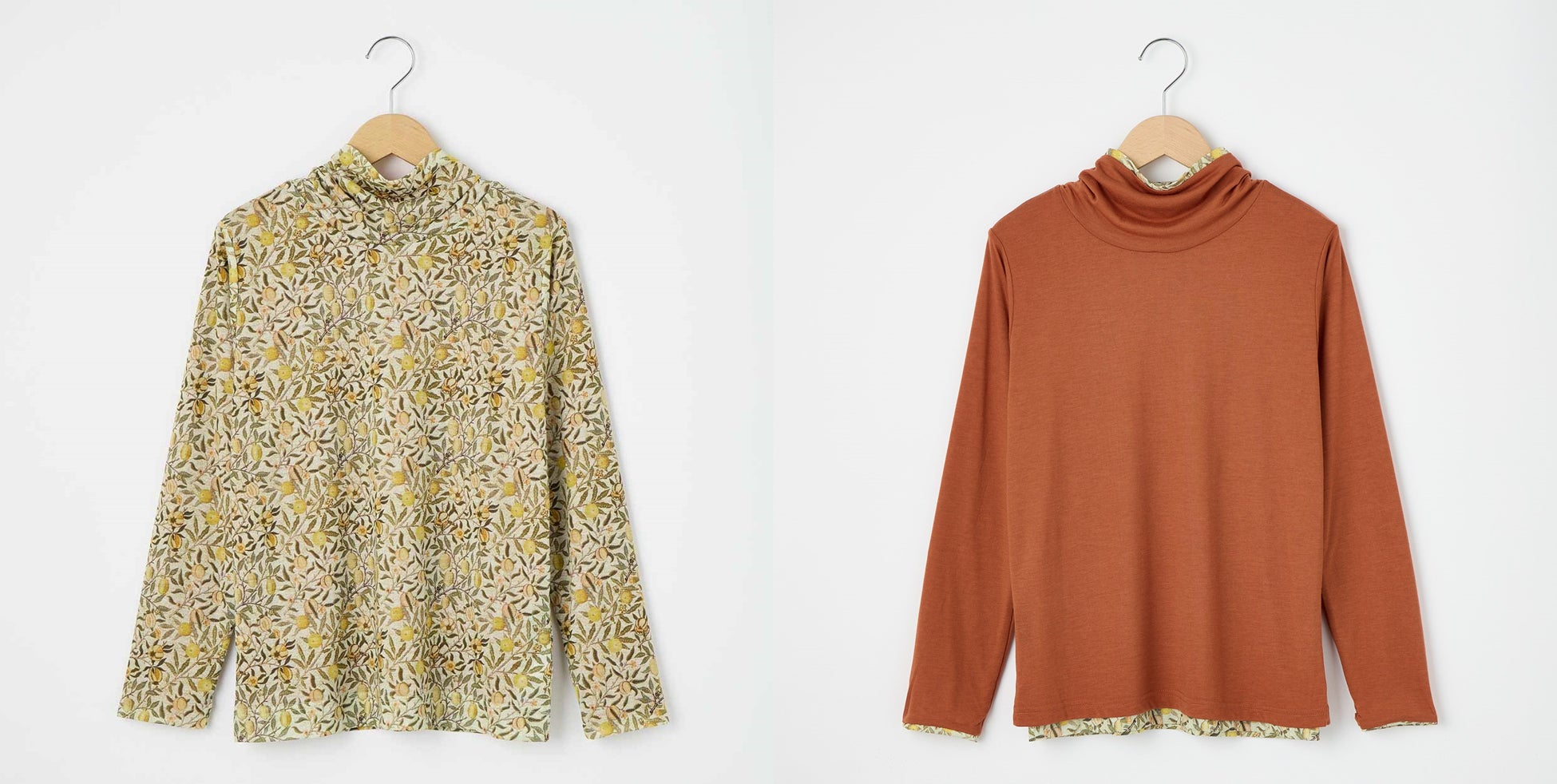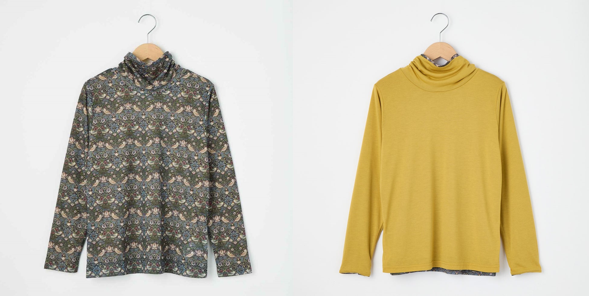 ジュネママンでは第2弾のアイテムとして、秋の装いにぴったりなジャンパースカートや羽織アイテムなど、コーディネートや気温調整しやすい商品を販売します。キルトジャケットとインナーTシャツはリバーシブル仕様のため、ウィリアム・モリスの柄をファッションにさりげなく取り入れられます。