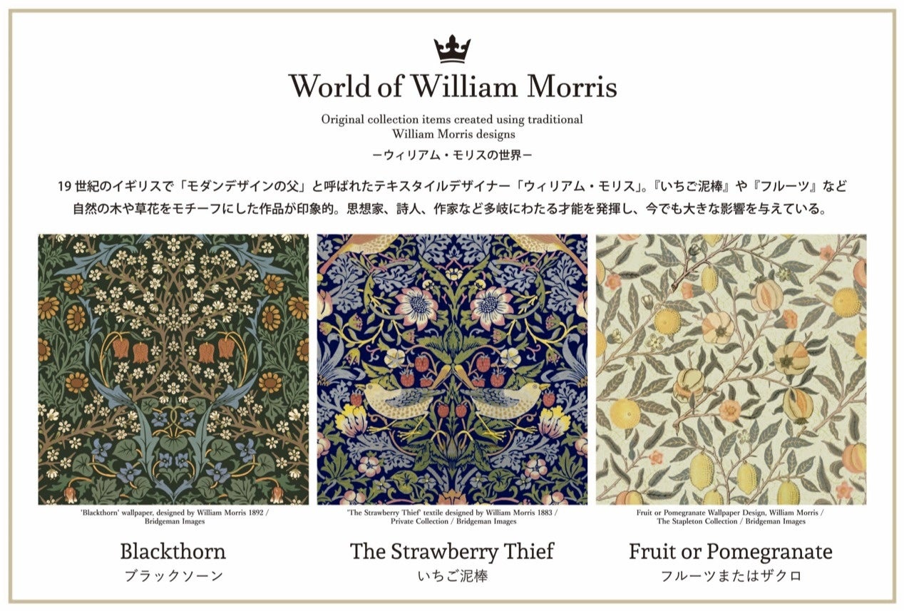 「William Morris(ウィリアム・モリス)」は19世紀のイギリスで「モダンデザインの父」と呼ばれたテキスタイルデザイナーで、“いちご泥棒”や“フルーツ”など自然の木や草花をモチーフにした作品が印象的です。思想家、詩人、作家など多岐にわたる才能を発揮し、今でも大きな影響を与えています。