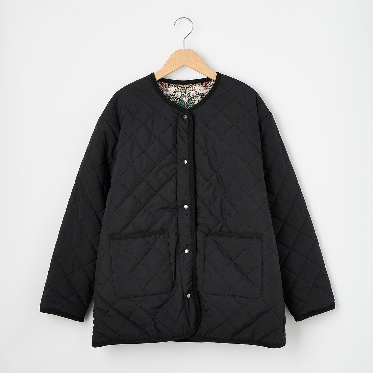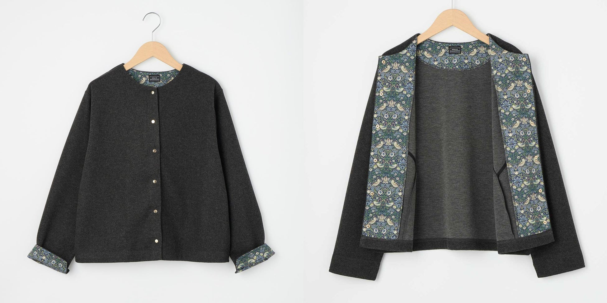 表地は無地、裏地は“いちご泥棒”のノーカラーキルトジャケットです。リバーシブル仕様のため、柄を表に出して着用することもできます。※10月18日(土)発売予定