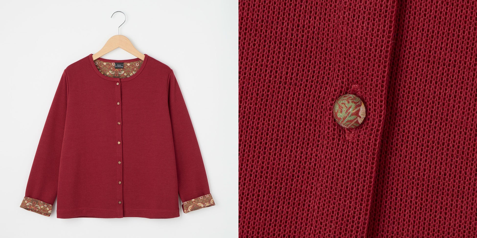 ノーカラーのシンプルなカーディガンです。背当て部と袖裏にウィリアム・モリスの柄をあしらっています。プリント生地でつつんだ、こだわりのくるみボタンを採用しました。