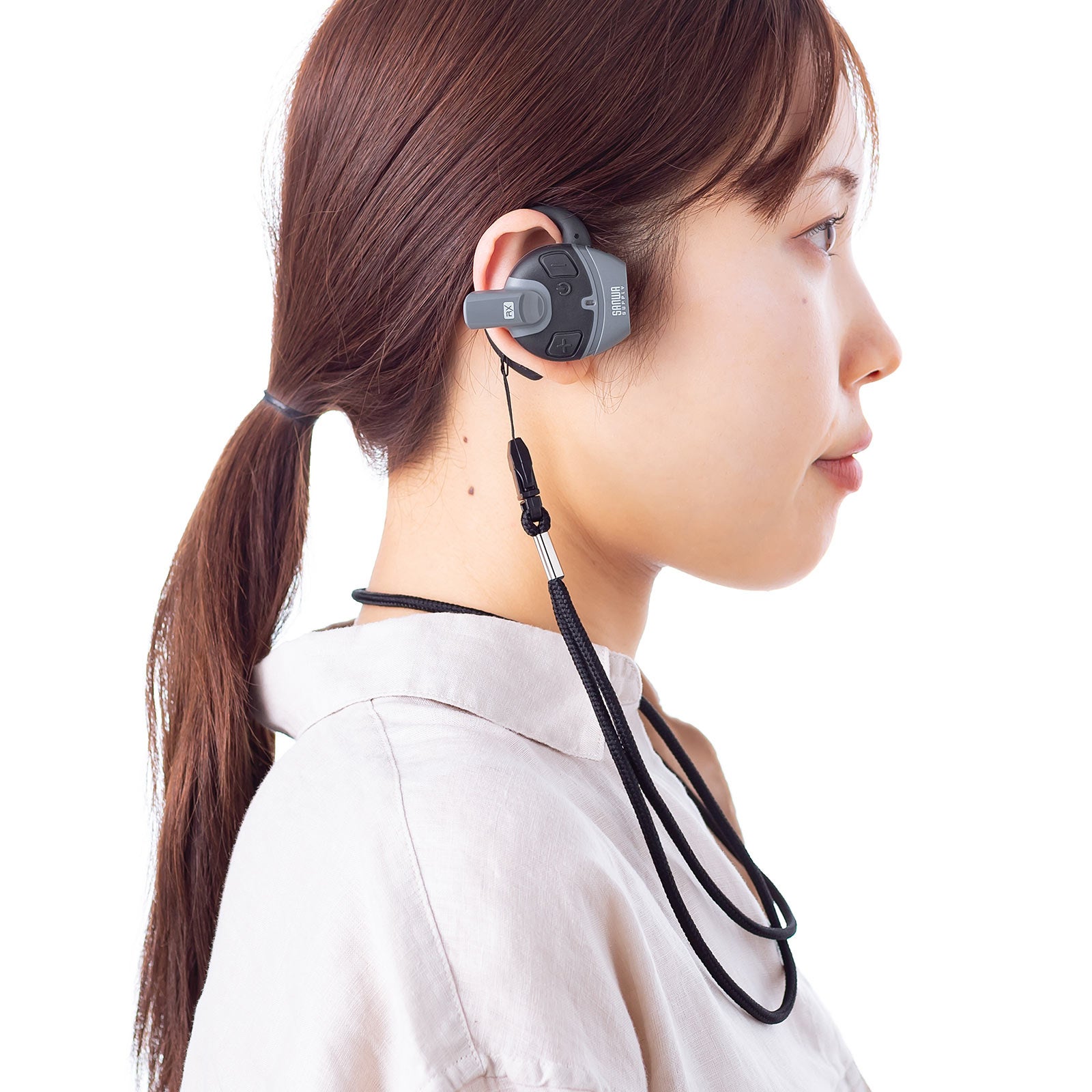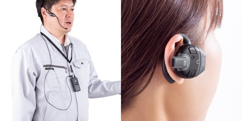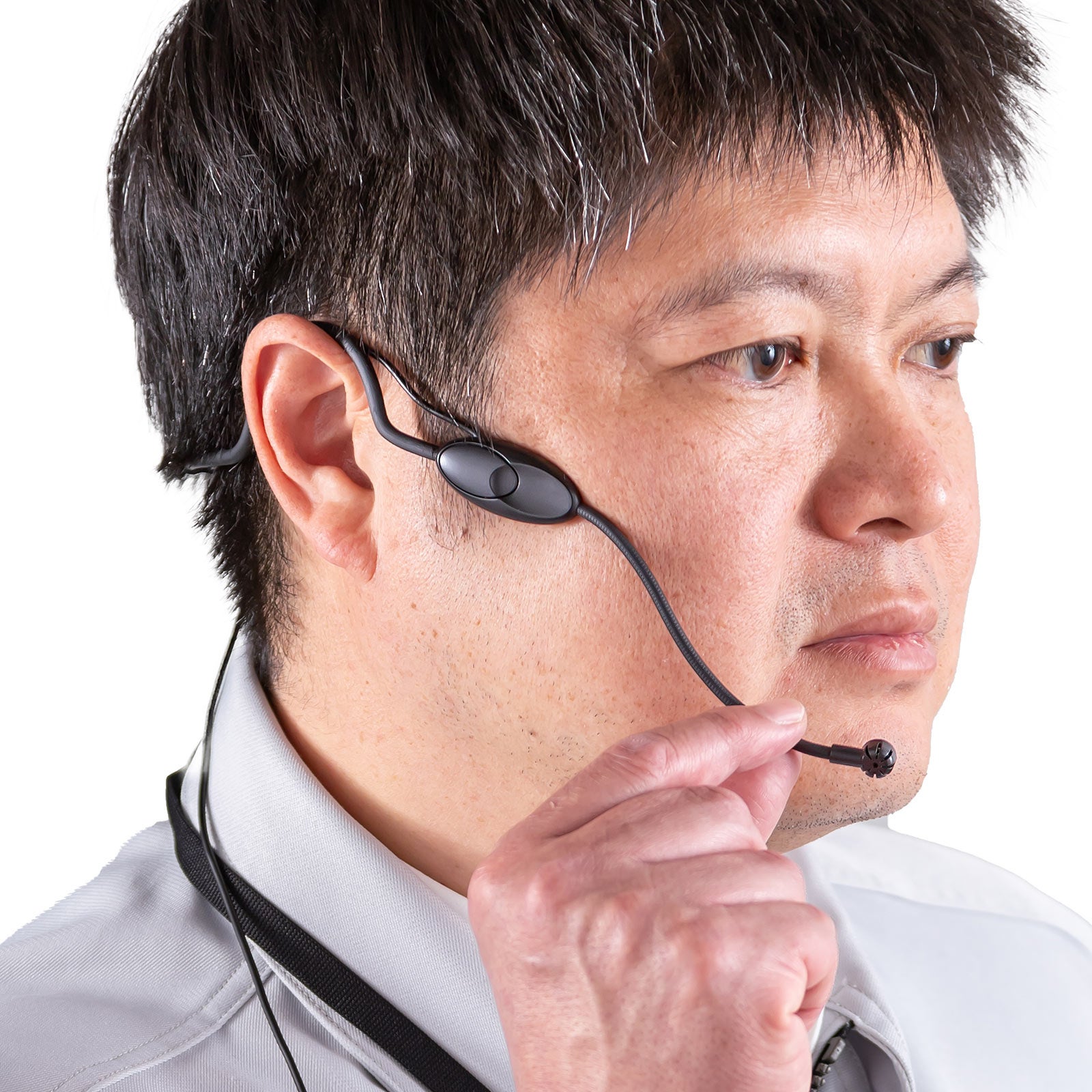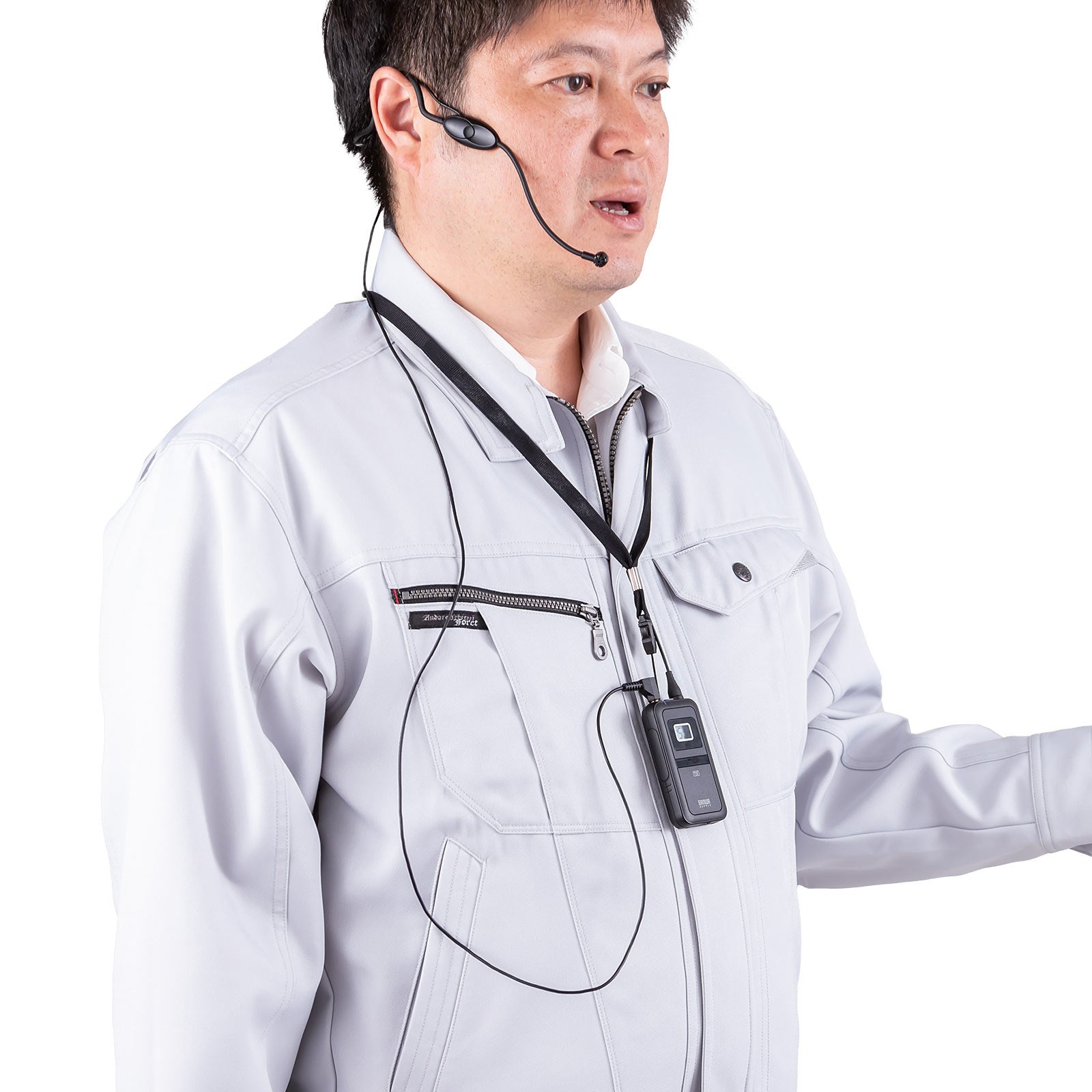 ネックバンド型マイクを採用し、ヘルメット装着時でも使いやすさをキープ。フレキシブルアームでマイクの位置調整も自在。工場や建設現場など、作業中の安全性と快適さを両立しています。