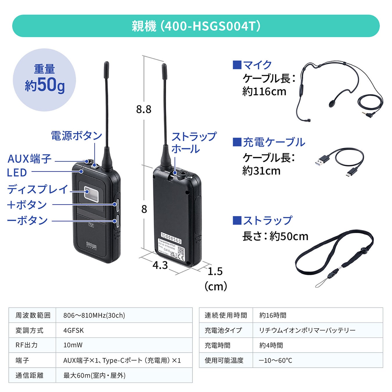 ワイヤレスガイドシステム 親機 ガイド用イヤホンマイク ツアーガイドシステムマイク 単方向通信 1チャンネル最大100台接続 工場見学 旅行 団体 無線 シスガイド 軽量