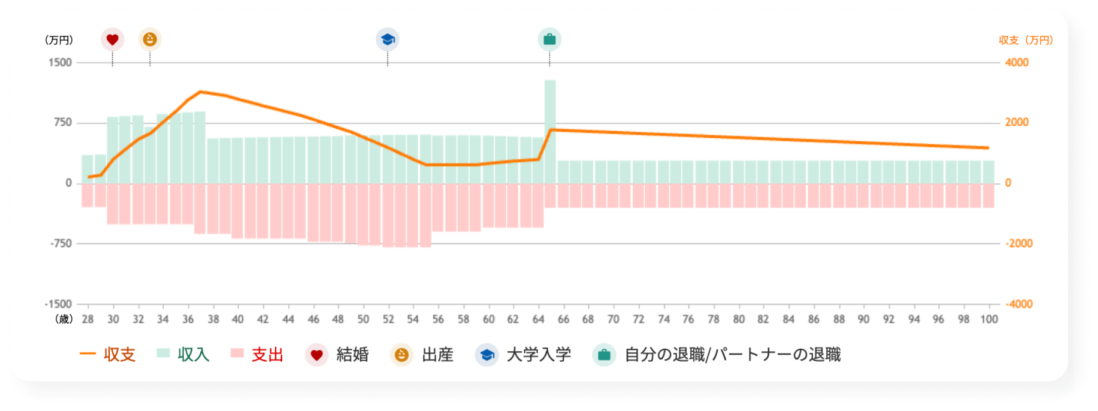 試算の結果をグラフで表示するとともに、収支改善や働き方等のアドバイスの提示、活用できる都の支援策を紹介します。