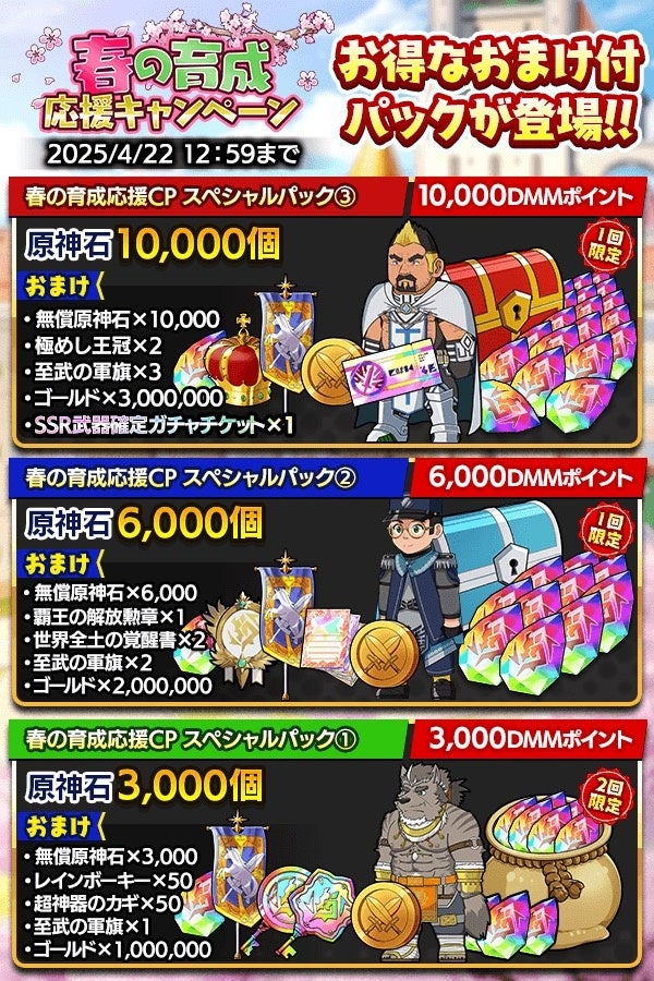 原神石に加えレアな育成素材、『SSR武器確定ガチャチケット』など豪華なおまけをおトクに入手できる「春の育成応援CPスペシャルパック」が3種登場!この機会をお見逃しなく!