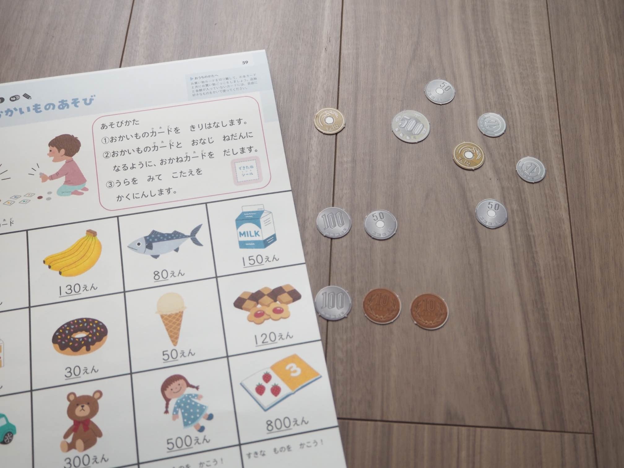 身の回りにある数の題材として、「お金」を扱っています。お金カードを使ってお買い物遊びをするなど、大きな数にも親しみます。