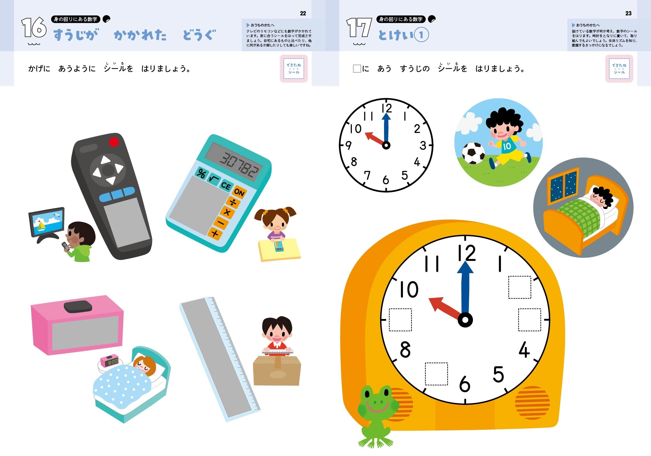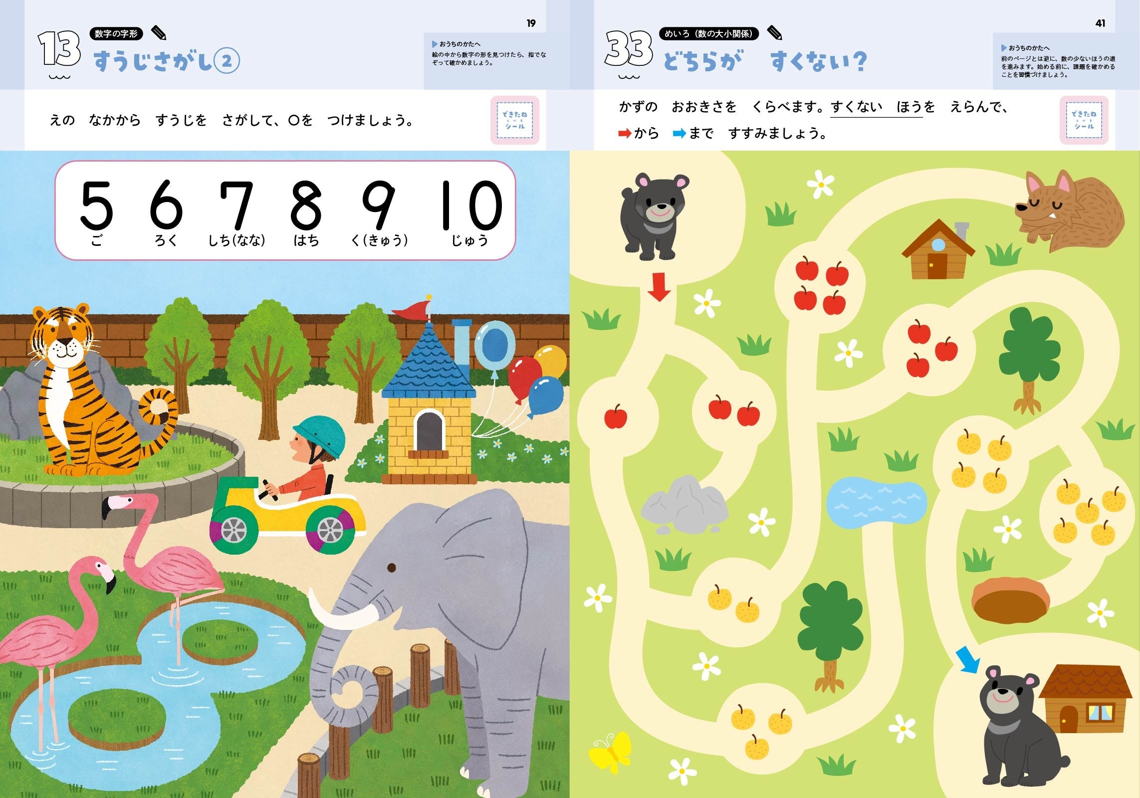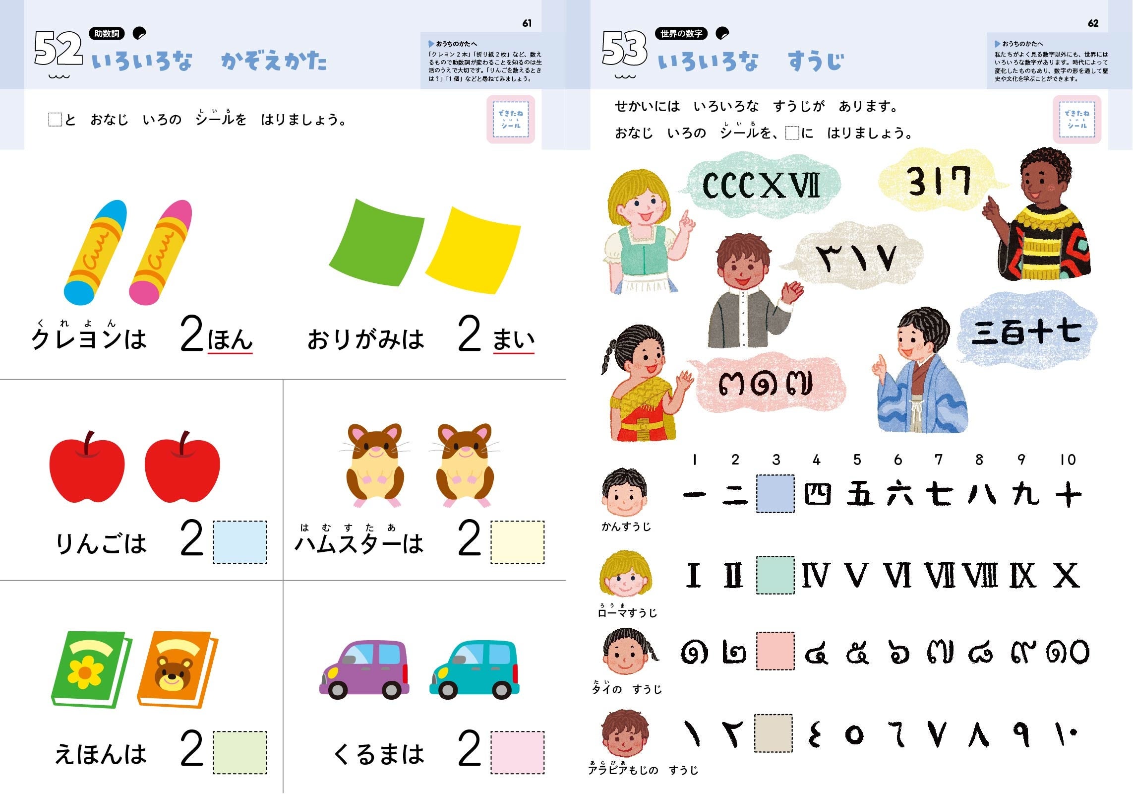 本書には、モンテッソーリ教育の実際の現場で使われているのと同様の、教材が付属しています。何度も手で触れて、操作することによって感覚的な数の体験をし、「数量」を意識することから始めましょう。それを踏まえて、身近なテーマを通し、「数え方」や「数字」について興味を広げていきます。