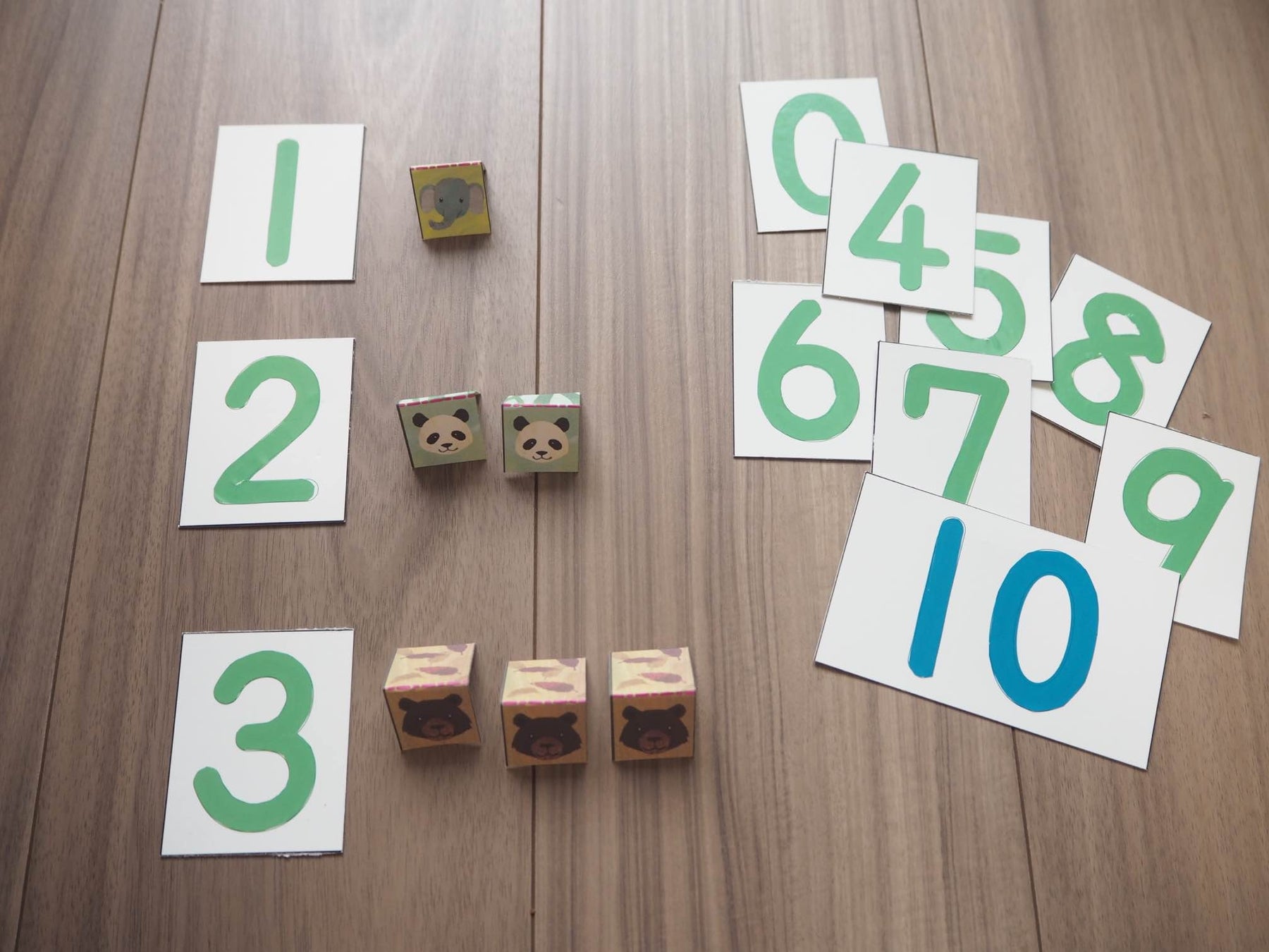 数字カードと同じ数だけ動物カードを並べて遊ぶと、数字と数量の一致に繋がります。