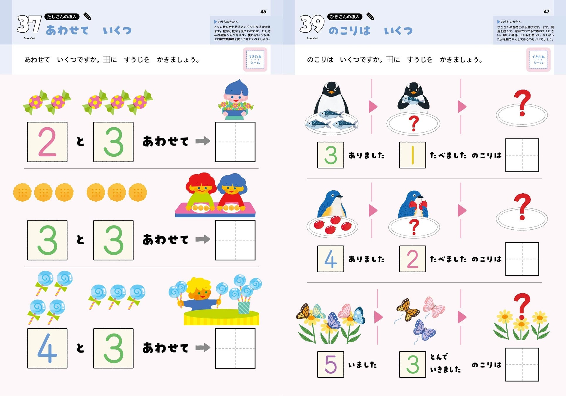 ワークの中にはさまざまな色や絵の表現があり、お子さんの好きなモチーフが数多く登場します。想像したり、創作したりしながら、数を操作すること、算数の楽しさを体験しましょう。